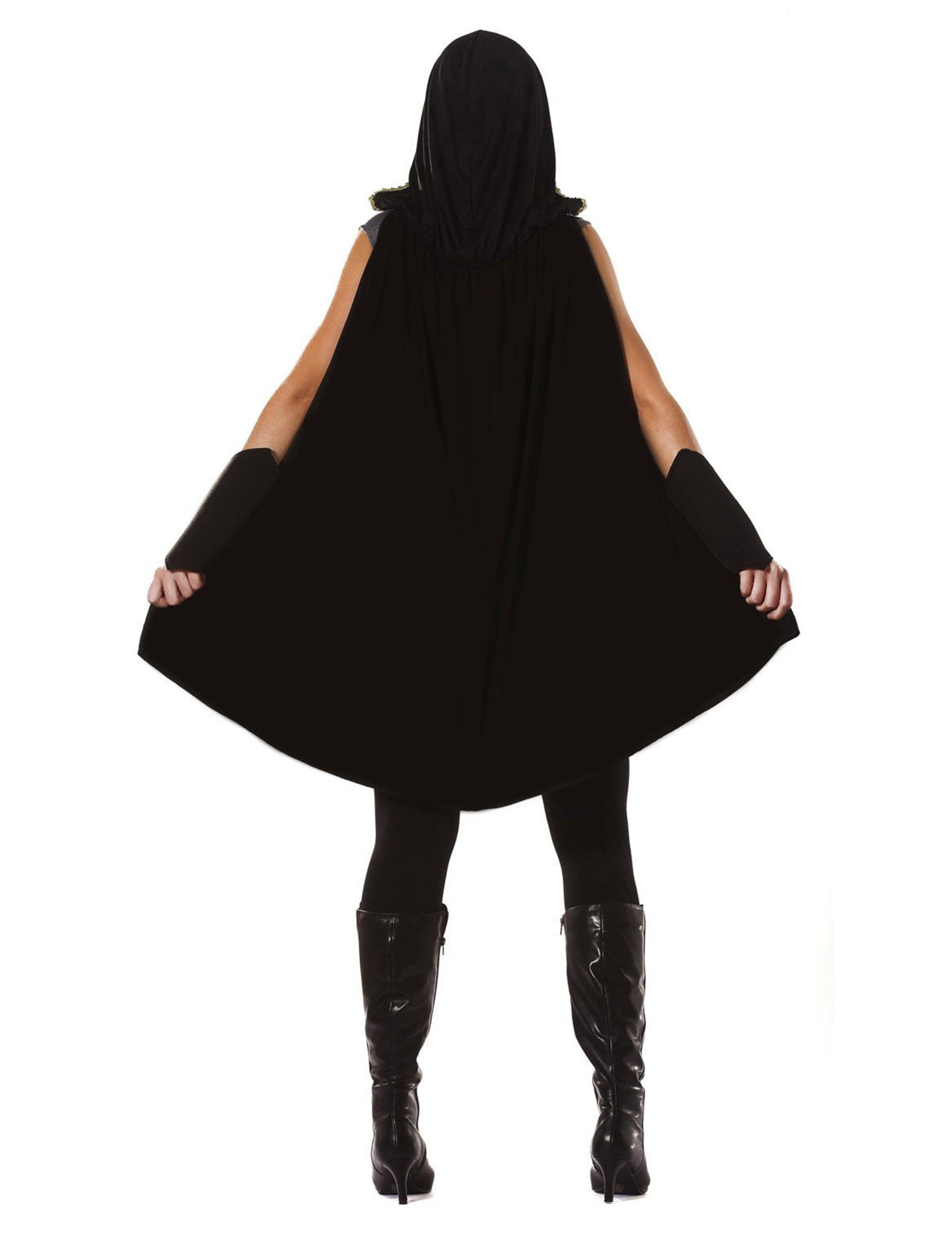 Tento kostým Archer pre ženy obsahuje šaty s mysom, dve manžety a pás (pančuchy, oblúk a topánky, ktoré nie sú zahrnuté). Šaty sú sivé, krátke a bez rukávov. Tkanina je plynulá a bude príjemná na nosenie. Čierny mys je poškriabaný na pleciach a má veľkú zlatú kapucňu, ktorá pokryje všetky vaše vlasy. Rameno z koženého vzhľadu je zošité v diagonále poprsie. Je tu falošná zlatá slučka. Manžety sú vyrobené z čiernej peny s elastickou časťou, ktorá ich ľahko umiestni. Nakoniec bude opasok zviazaný vzadu a predstavuje krásnu zlatú tlač predstavujúcu najmä Phoenix v jeho strede. Toto veľmi ženské maskovanie Archère bude ideálne na hranie banditov lesa počas prestrojenej udalosti.