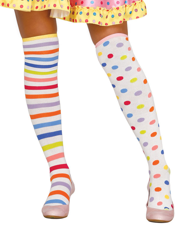 Táto šarža pozostáva z pár klaunských pančúch pre ženy. Nepriehľadné ponožky, sú nesúladne. Jeden je biely s viacfarebnými pruhmi a druhý je biely s viacfarebnými polkaovými bodkami. Tieto pančuchy budú ideálne na dokončenie klaunského kostýmu pre karneval.