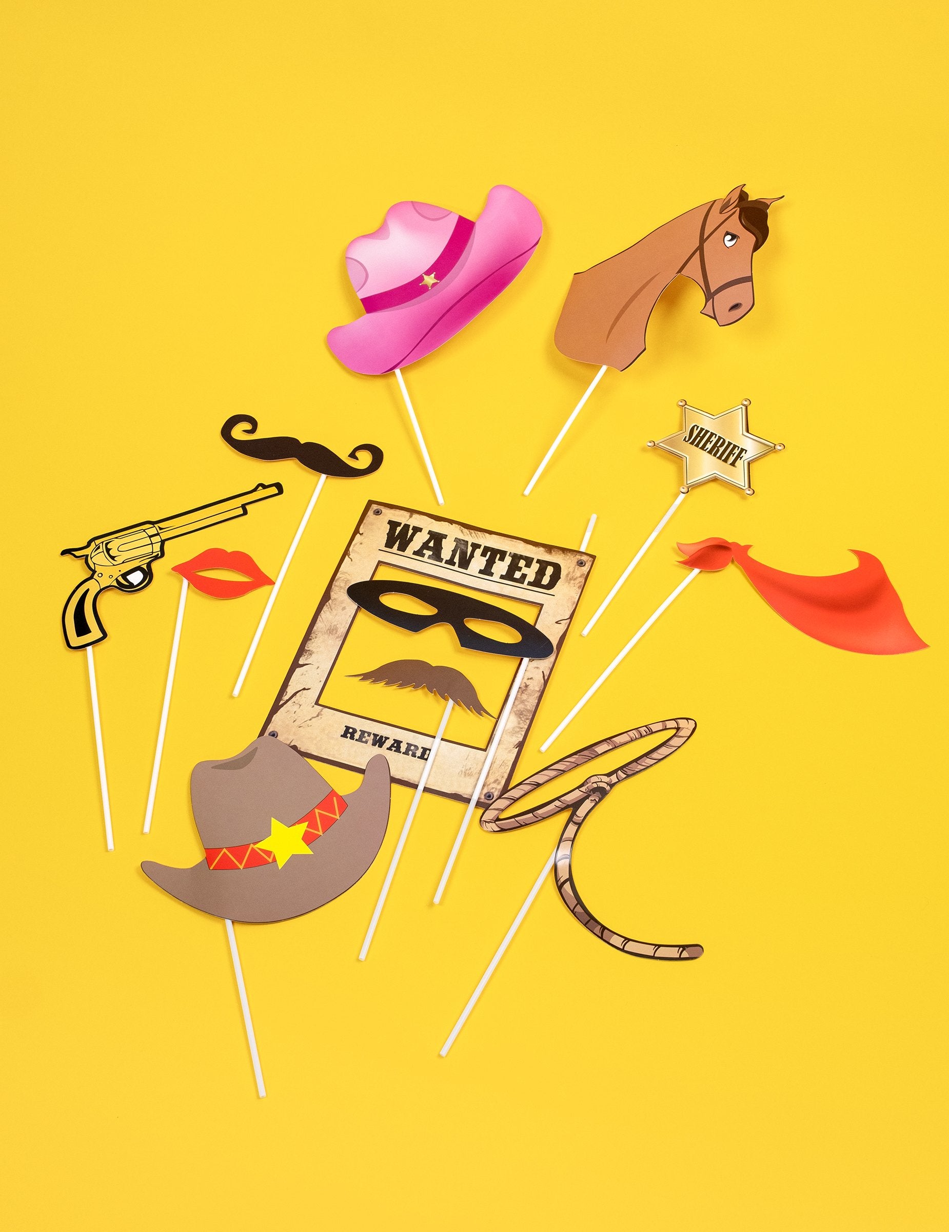 Táto súprava PhotoBooth je vyrobená z 12 kartónových prvkov, pripevnených na plastových vrcholoch 23 cm výšky. Prvky, na tému západného, predstavujú: - 2 fúzy, hnedá a čierna - 1 čierna bandita vlk - 1 lasso - 1 United Red Bandana - 1 hnedý kôň - 1 kovbojský klobúk - 1 kovbojský klobúk číry - 1 šerif - 1 šerif Hviezda - 1 Zlatá žltá pištoľ - 1 červená ústa - 1 „Wanted“ Plagát Táto súprava pre fotobooth bude ideálna na vytvorenie originálnej animácie pri príležitosti večera na tému Cowboys.