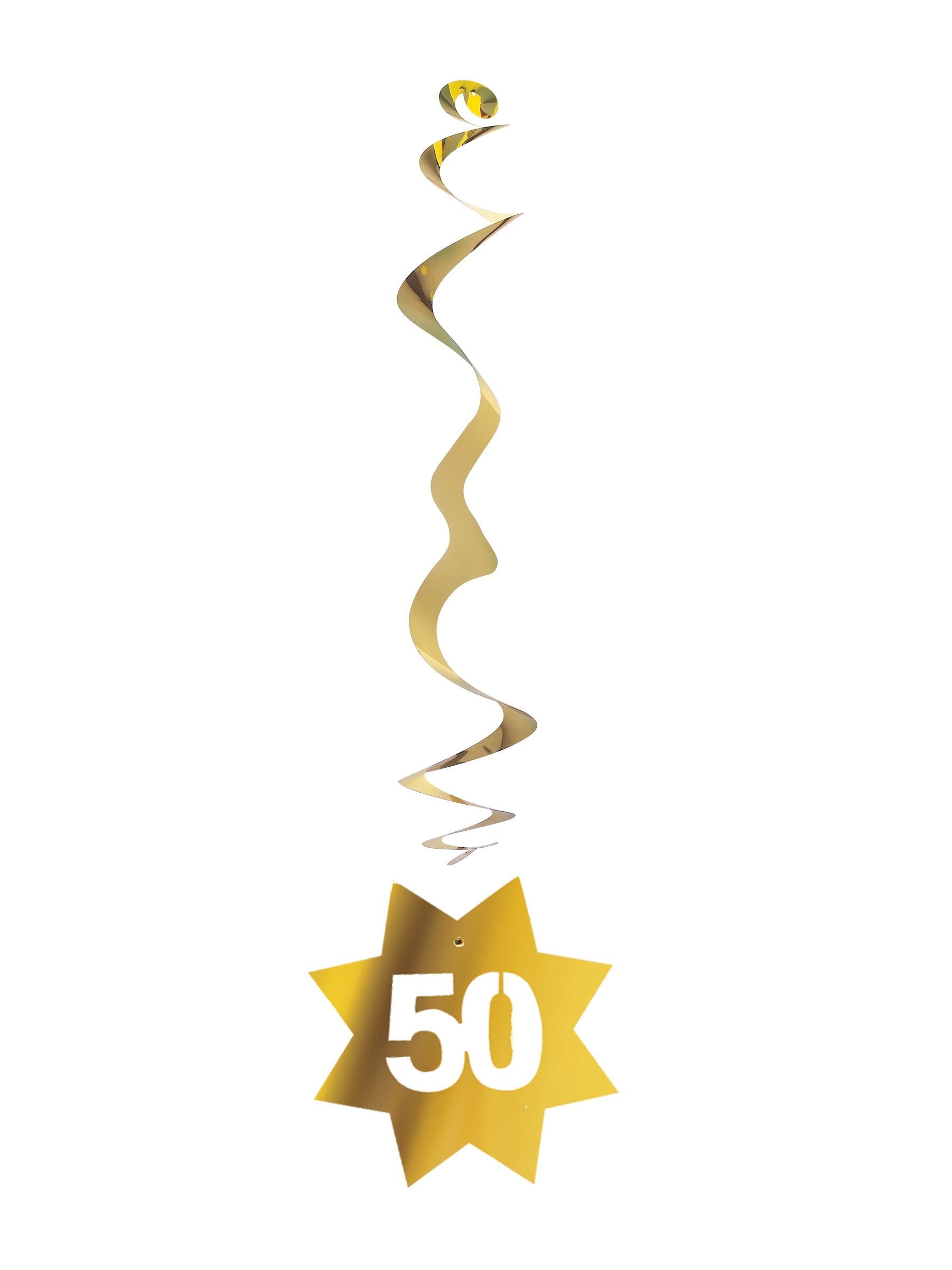 Dodajte svojej oslave nádych lesku s týmto setom zlatých dekorácií vyrobených z nehorľavého papiera. Tento kit obsahuje 6 špirálových závesov ozdobených hviezdou s číslom 50.