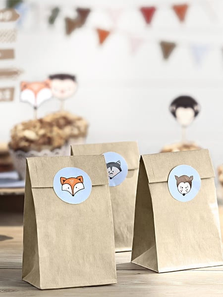 Táto súprava obsahuje 6 vrecúšok vyrobených z prírodného kraftového papiera a 6 dekoratívnych samolepiek. Vrecúška majú rozmery 7,5 x 18,5 cm. Okrúhle nálepky s priemerom 4 cm zobrazujú roztomilé lesné zvieratká na jemnom modrom pozadí, ideálne na elegantné uzatvorenie vašich balíčkov. Naplňte ich sladkosťami alebo drobnými darčekmi a potešte svojich hostí. Tieto doplnky sú ideálne na oslavu baby shower alebo organizovanie tematickej narodeninovej párty.