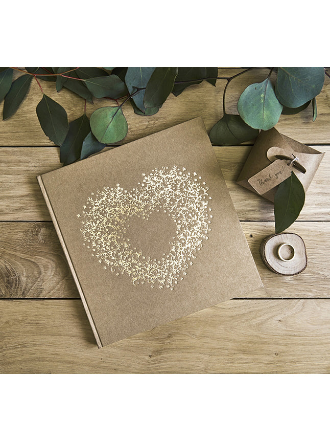 Tento zlatý kniha hostí vyrobený z prírodného kraft kartónu obsahuje 22 strán. V praktickom formáte 20,5 x 20,5 cm má na obálke nádherné zlaté arabesky, ktoré vytvárajú elegantné srdce. Je to ideálny spôsob, ako zachytiť odkazy a spomienky vašich blízkych počas vašej svadby.