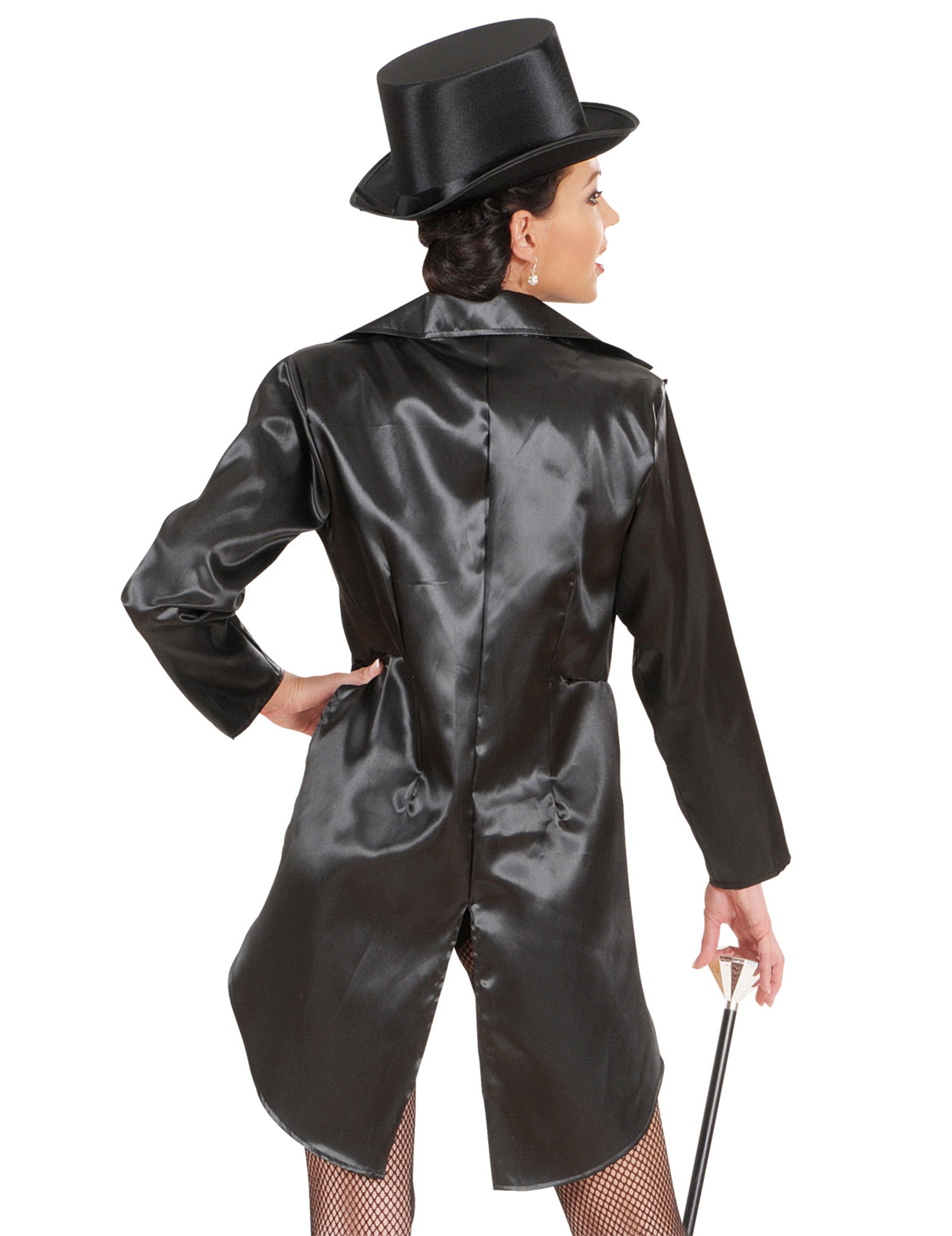 Tento vynikajúci frak pre chvost pre ženy je čierna (kombinácia, klobúk, trstina, pančuchy a motýlik nie sú zahrnuté). Je špeciálne vyrobený pre pódiový tanečník a je navrhnutý počas brilantného saténu. Tento frac sa dá nosiť počas show (napríklad mágia) alebo počas karnevalovej párty. Autorské práva Widmann SRL