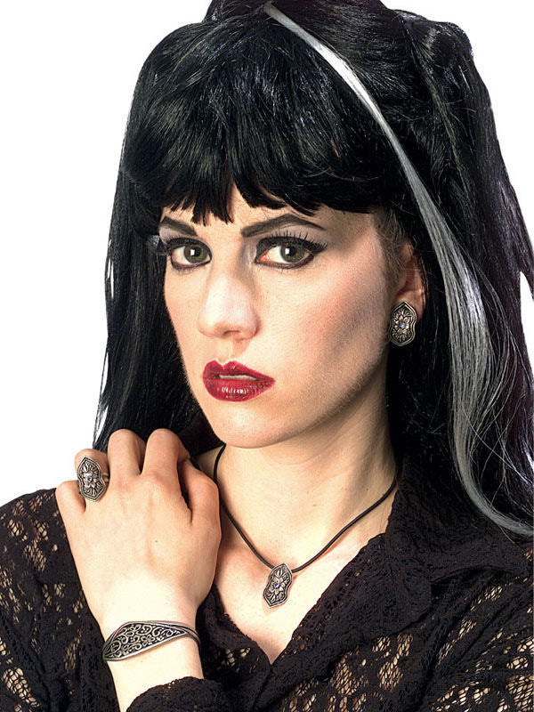Nikdy nevychádzajte na Halloween z domu bez ozdôb! S touto gotickou súpravou šperkov si môžete byť istí, že vás každý obdivuje! V tejto súprave nájdete všetko, po čom túžite: náhrdelník, prsteň, náušnice a náramok!
