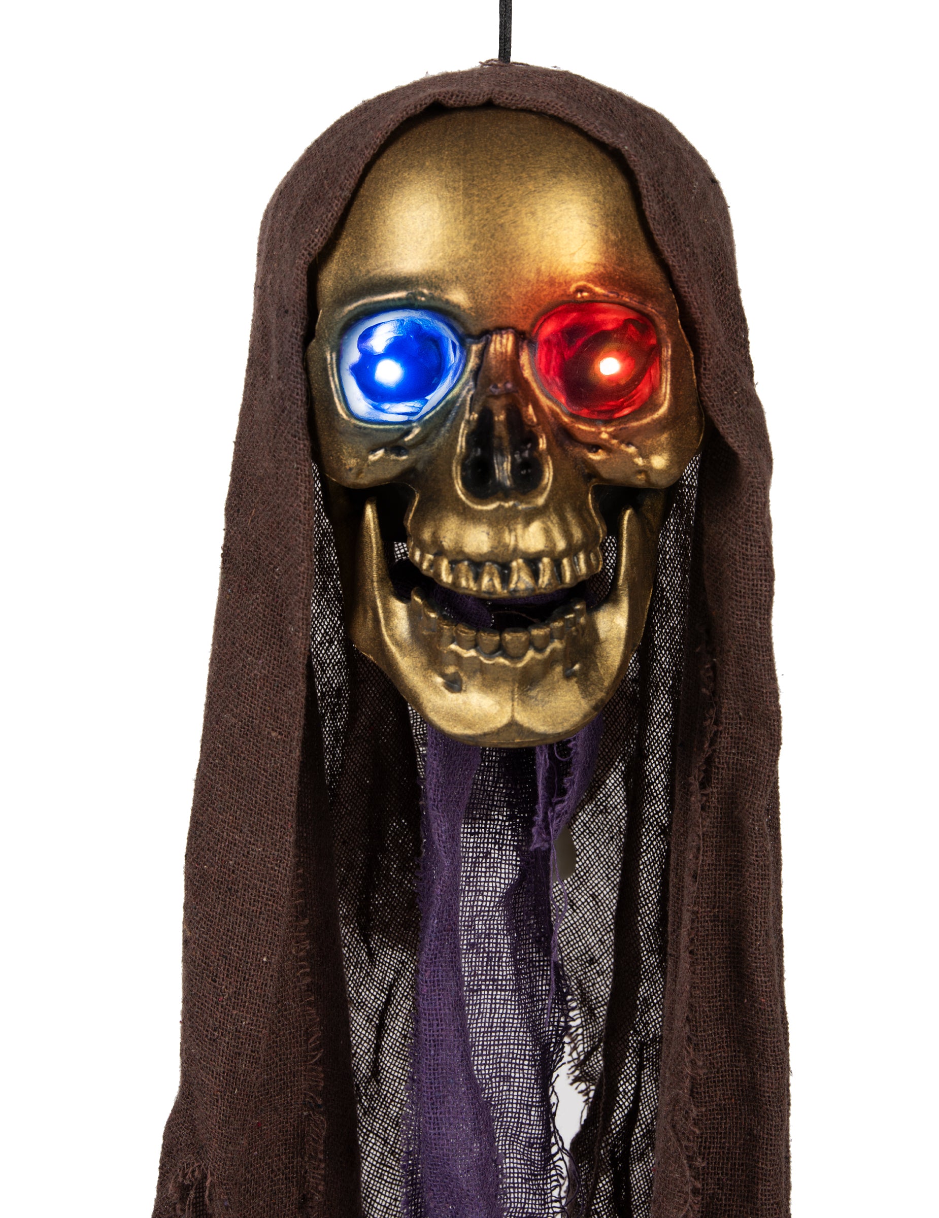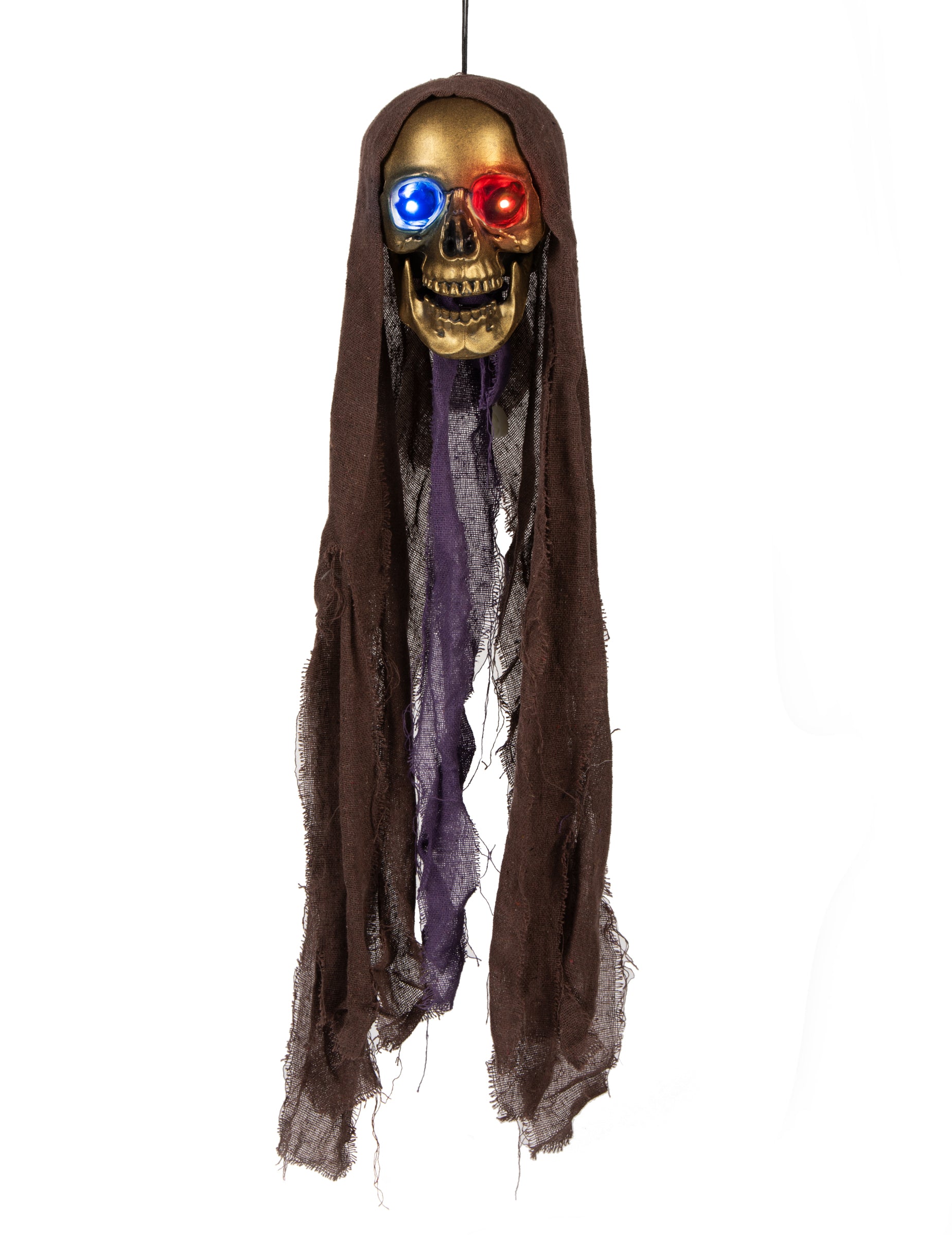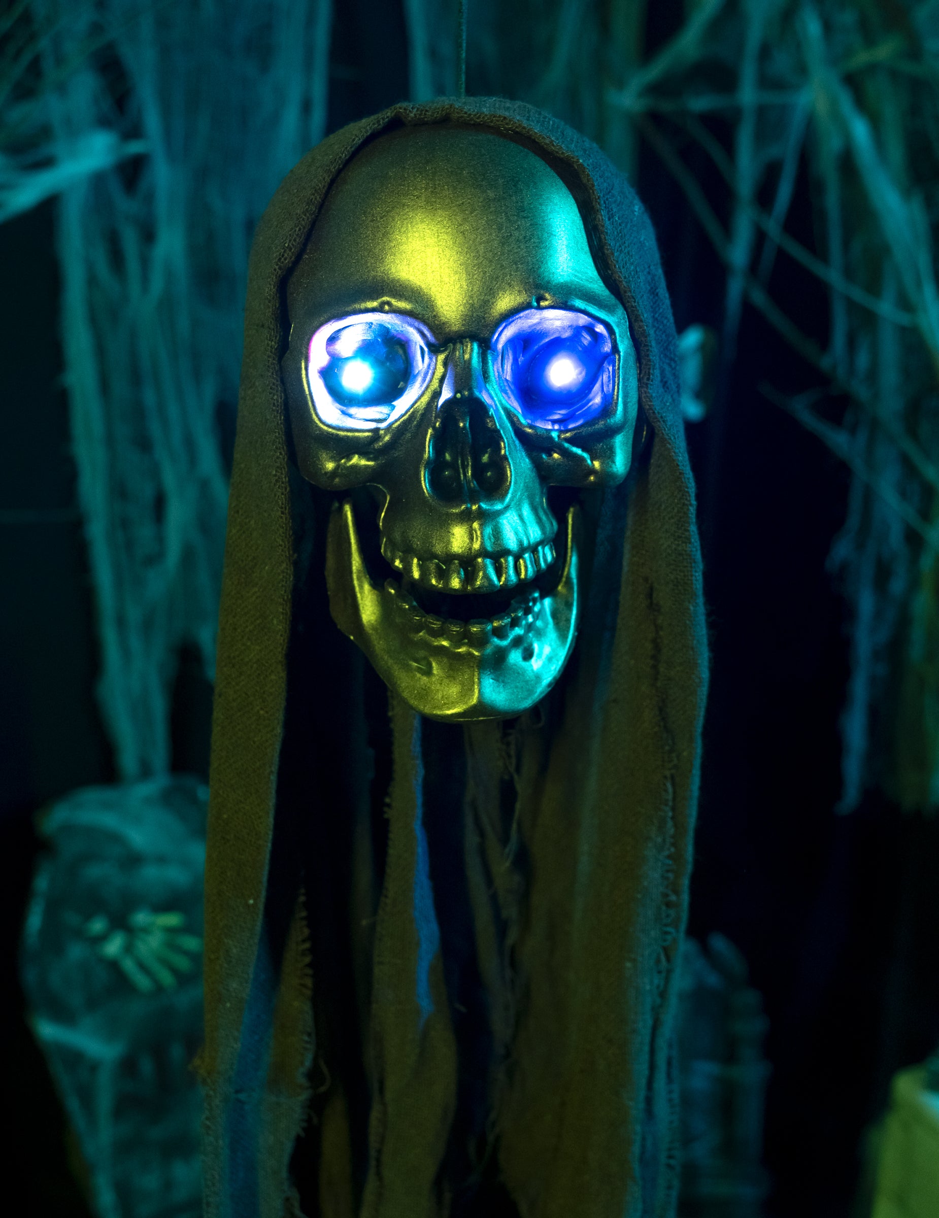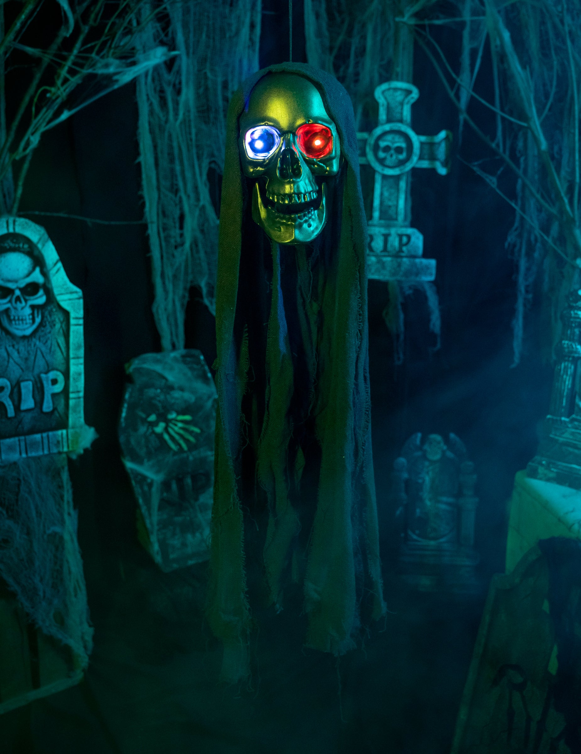 Tu je nádherná kostrová hlava s patinou pripomínajúcou opotrebovanú meď. S roztrhanými závojmi a doširoka otvorenými čeľusťami určite vystraší mnohých. Jej najlepšia vlastnosť? S 3 gombíkovými batériami LR44, ktoré sú súčasťou balenia, bude táto dekorácia žiariť očami všetkých farieb. Pohľad, ktorý by mohol vystrašiť aj to najnáročnejšie oko, ak je dekorácia v noci v záhrade. V halloweensku noc nechajte svoju fantáziu uzdu a vytvorte desivú dekoráciu, ktorá vašim priateľom nabehne zimomriavky!