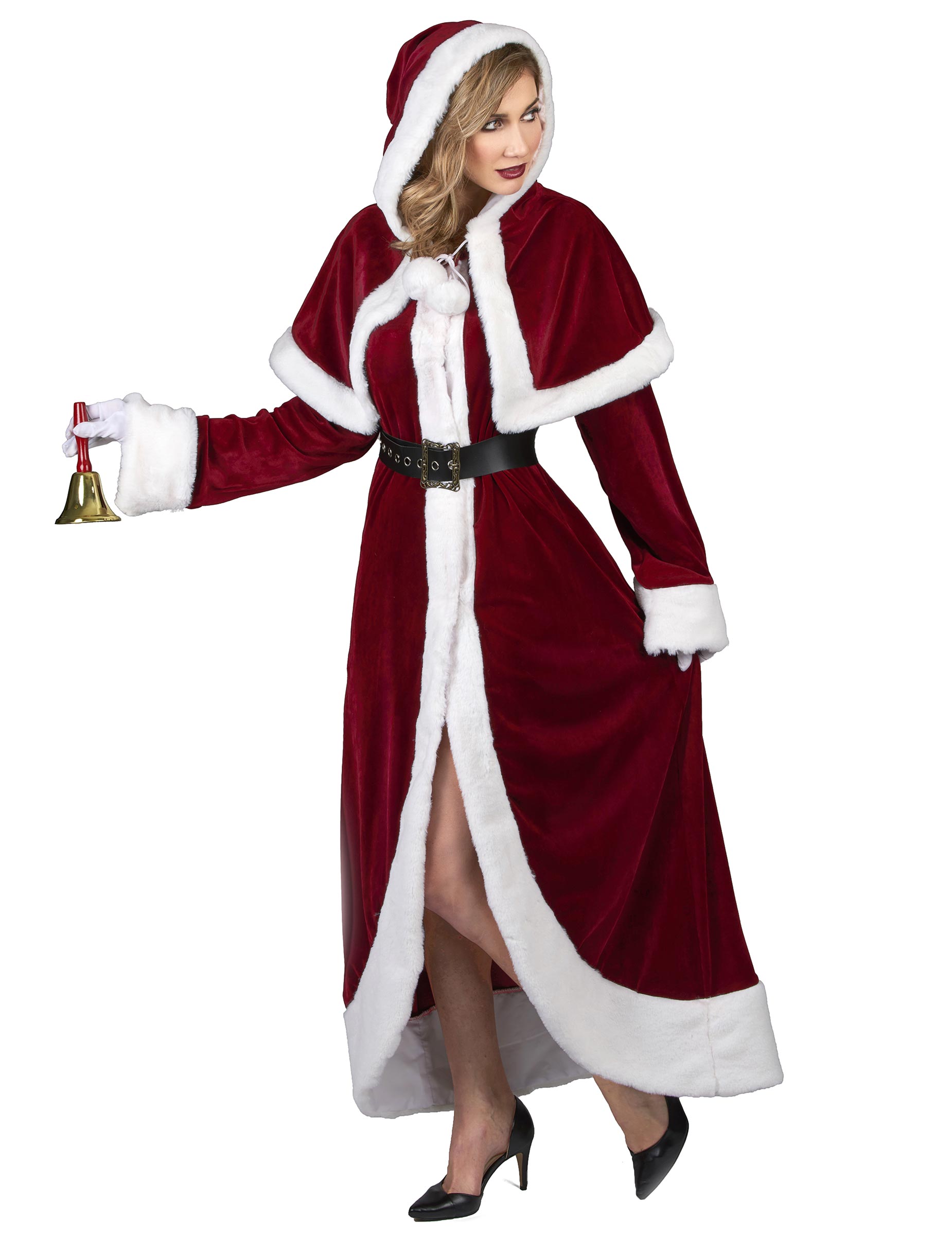 Tento veľkolepý vianočný kostým je určený pre ženy a zahŕňa šaty, pás a kapucňu. (rukavice, topánky a zvonček nie sú zahrnuté). Plyšová tkanina je veľmi vysoká kvalita, je flexibilná, silná a mimoriadne mäkká. Intenzívna červená je tmavá a má veľmi krásne odrazy. Šaty sa ohýbajú v páse vďaka napodobňovacej koži a kovovej sponke. Šaty s dvoma stranami sa zatvárajú spredu kovovými tlakmi. Cape je zviazaný vpredu vďaka dvom reťazcom dokončeným bielym pompoms. Veľmi elegantne pokryje vaše plecia, ako aj hornú časť chrbta. Kapucňa klasifikuje vaše vlasy klasicky. Táto sada bude ideálna na hranie ženskej ikony Santa Clausa počas vianočných sviatkov alebo na predstavenie.