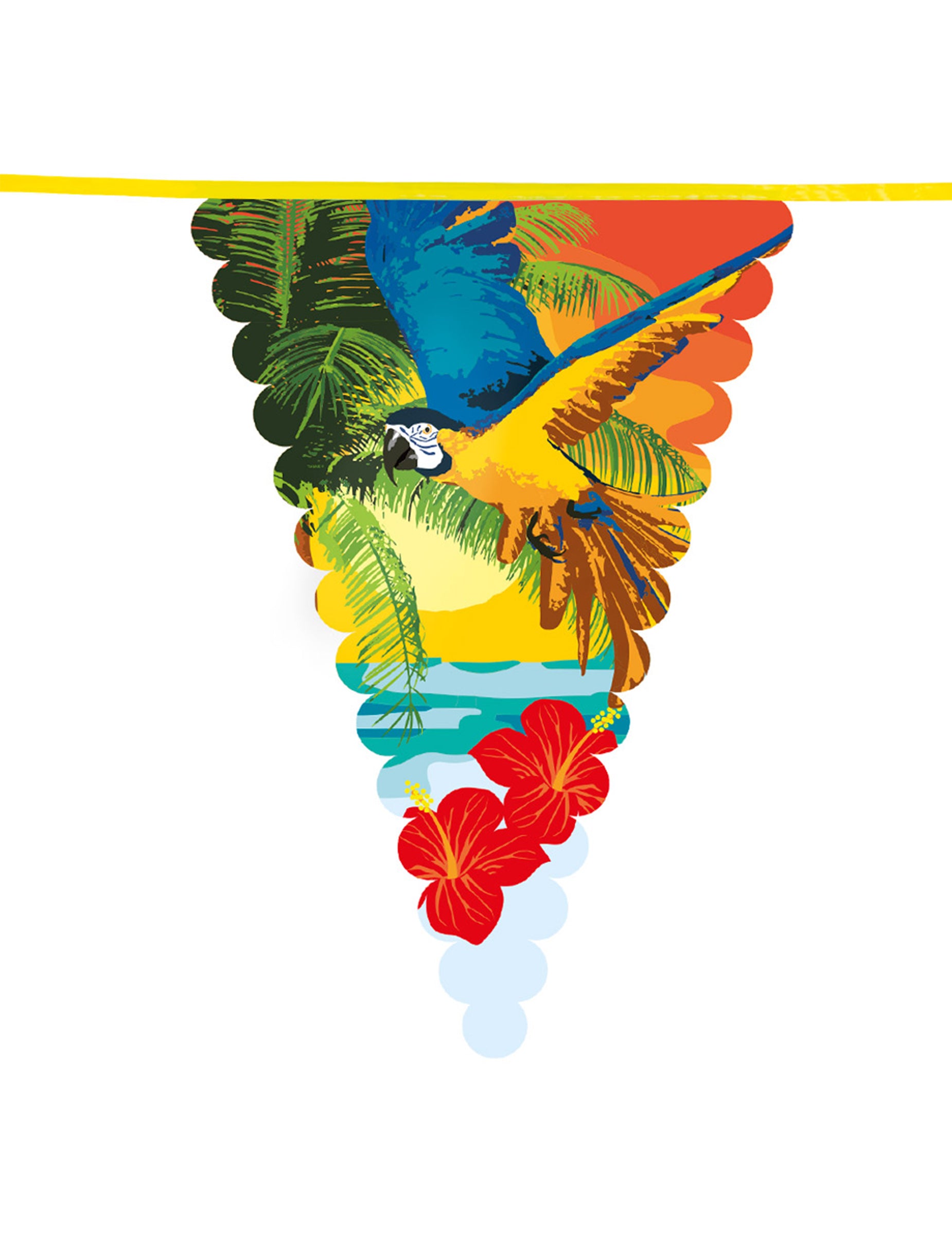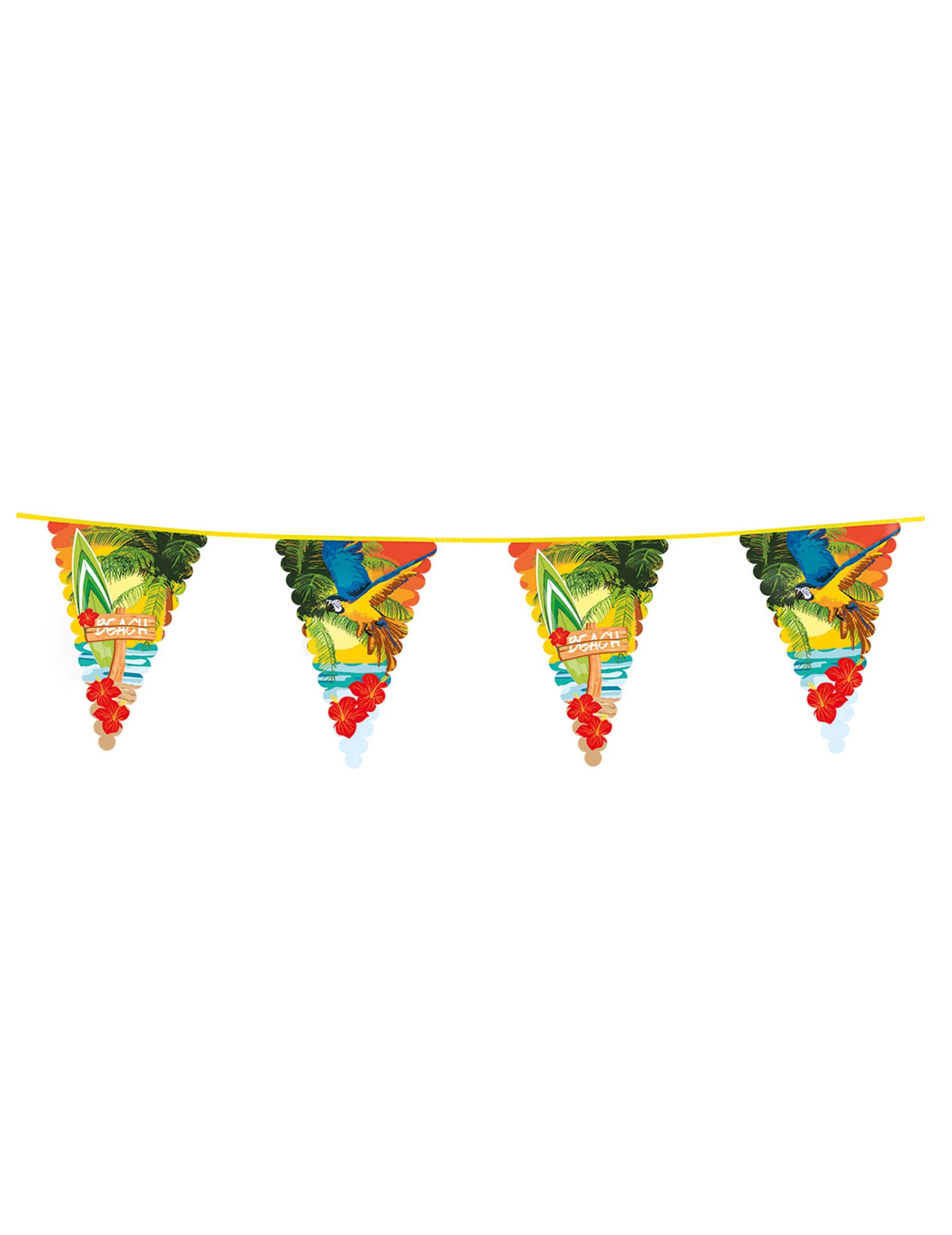 Táto „plážová párty“ girland pozostáva zo žltej plastovej šnúry 6 metrov ozdobených veľkými pennantmi 46 cm vysokými po dobu 30 cm šírky. V jemnom a flexibilnom plaste sa tieto pennanty ľahko pohybujú podľa vetra. Neoddravné pre letecký dekor na tému Havaj, pláže a leta.