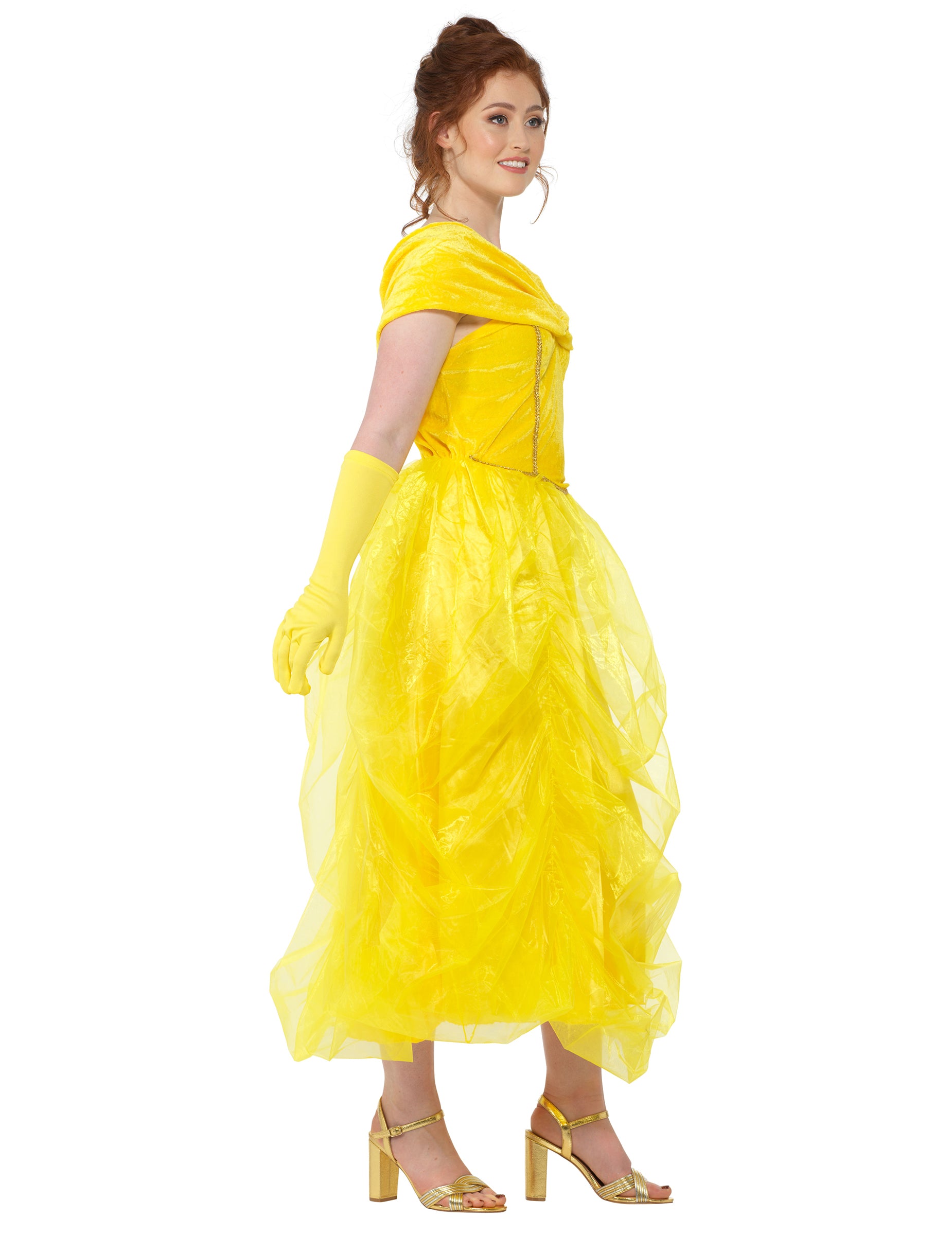 Tento krásny kostým princeznej pre ženy pozostáva zo šiat a rukavíc. V žltej farbe sú šaty dlhé s bandeau rukávmi na odhalené ramená. V spodnej časti šiat je pekný žltý tylový závoj. Rukavice sú dlhé a žlté, aby ladili so šatami. Tieto šaty budú ideálne na to, aby ste boli najkrajšie na maškarnej párty s priateľmi!