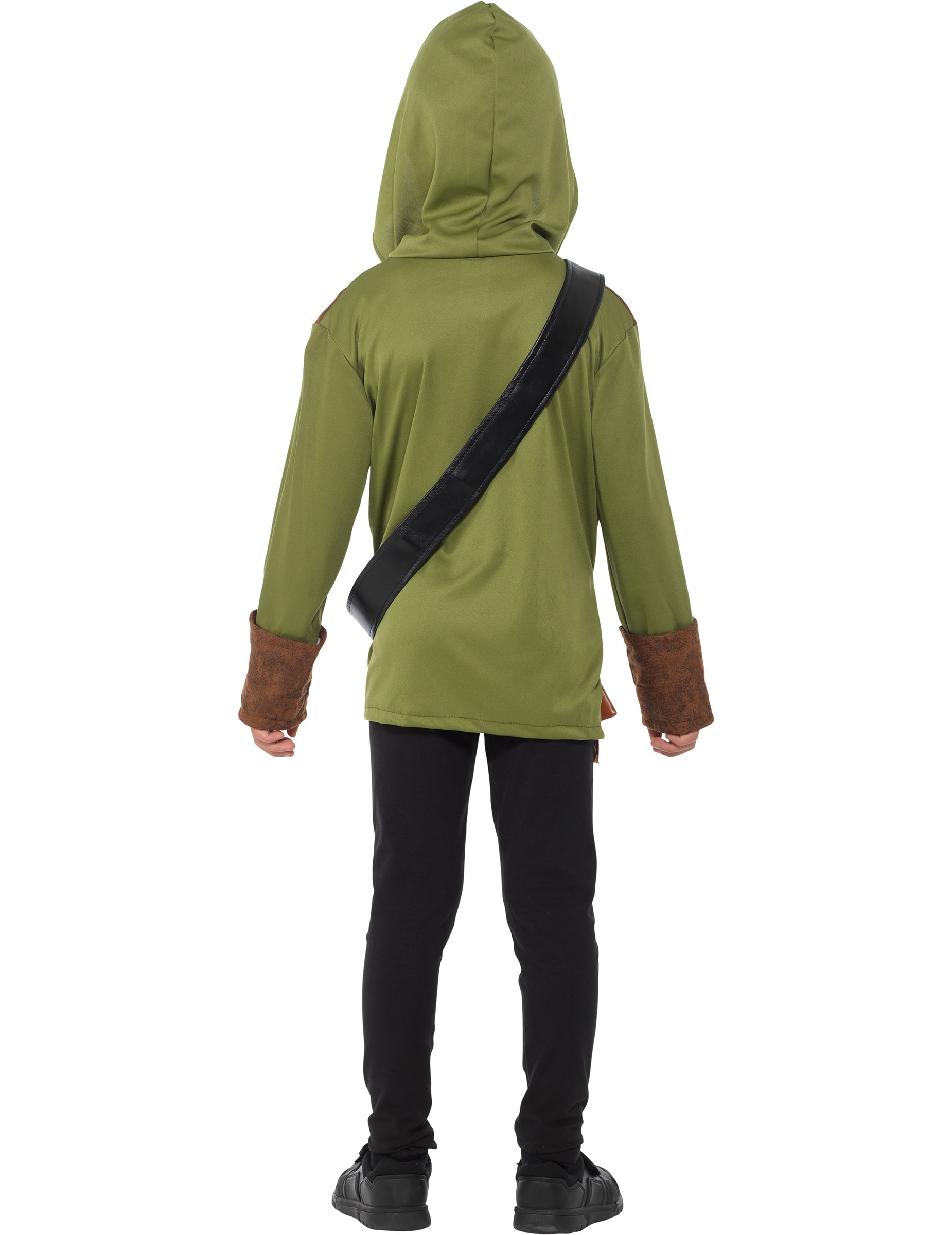 Toto mužské drevené maskovanie pre chlapca sa skladá z vrcholu s kapucňou, vesty, podväzkov, pásov a topánok (meč, nohavice a topánky nie sú zahrnuté). Vrchná časť s kapucňou je zelená a okraj jej rukávov je hnedá. Hnedá vesta je bez rukávov a je zošitá na vrchnej časti s kapucňou. Popruhy sú čierne a majú vrecko. Pokiaľ ide o topánky, sú hnedé. Táto súprava bude ideálna pre vášho syna pre maskovanú párty alebo karneval!