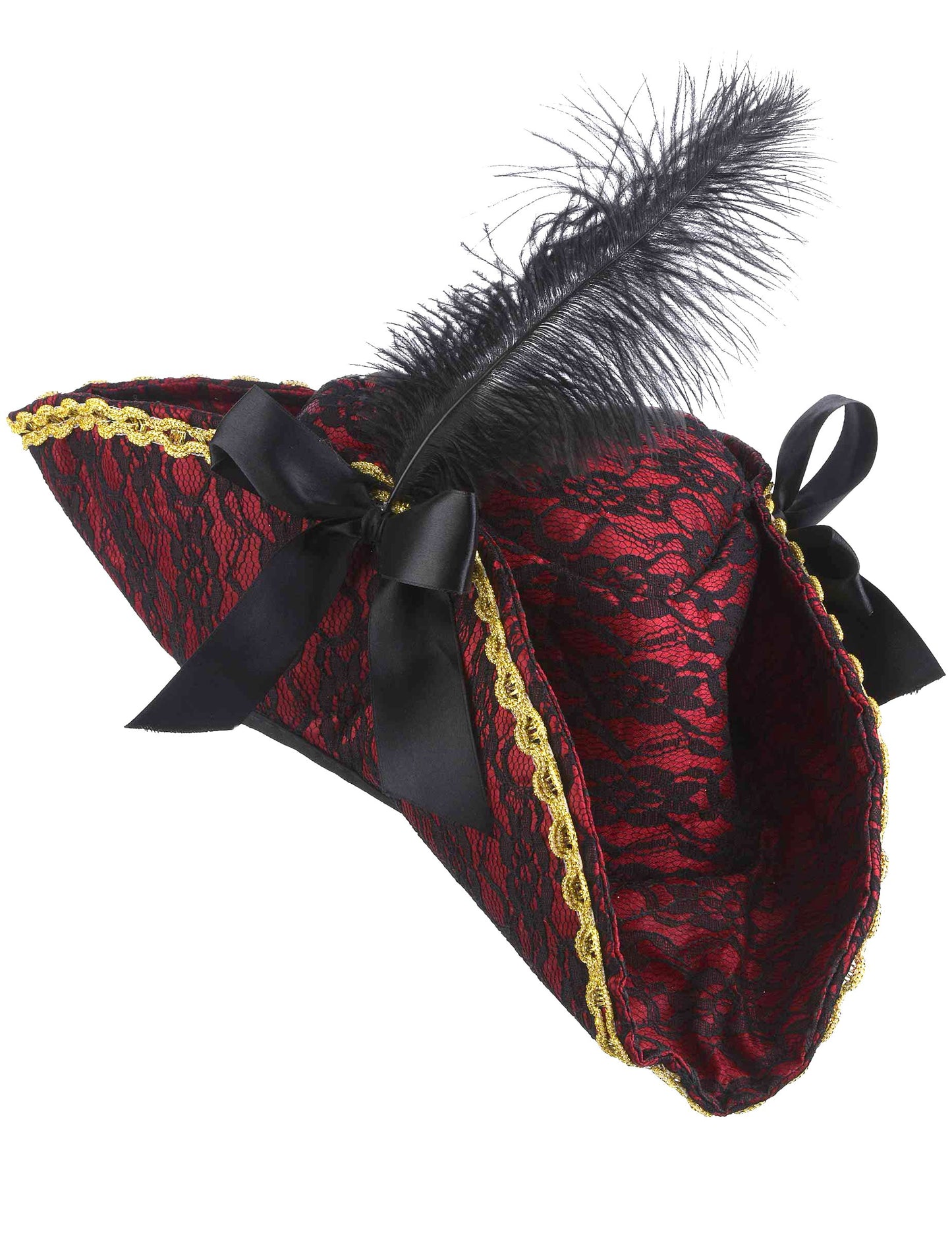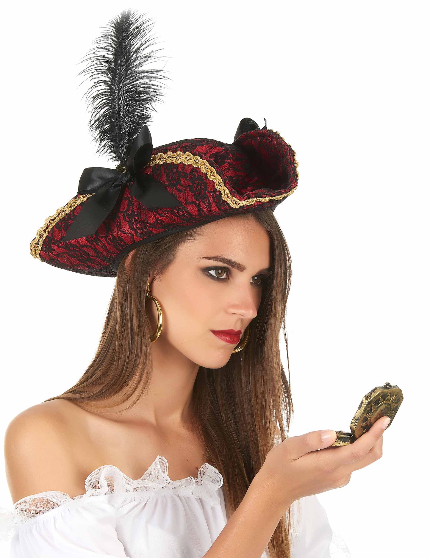 Tento vynikajúci pirátový trikorne pre dospelých má hlavnú vežu približne 60 cm. Vyrobené z látky lemovanej pružnou penou, bude mať vynikajúcu oporu. Galované zlatom a zdobené saténovým čiernym uzlom, ako aj čierne perie, okraje klobúka sú zložené v troch bodoch, aby sa tento autentický barokový vzhľad vytvoril. Jeho červená farba prekonaná čipkou z neho robí veľmi realistickú a kvalitatívnu hlavnú obálku, ktorá pri príležitosti vašej maskovanej alebo tematickej párty z neho pripomína svoje maskovanie ako pirátsky kapitán.