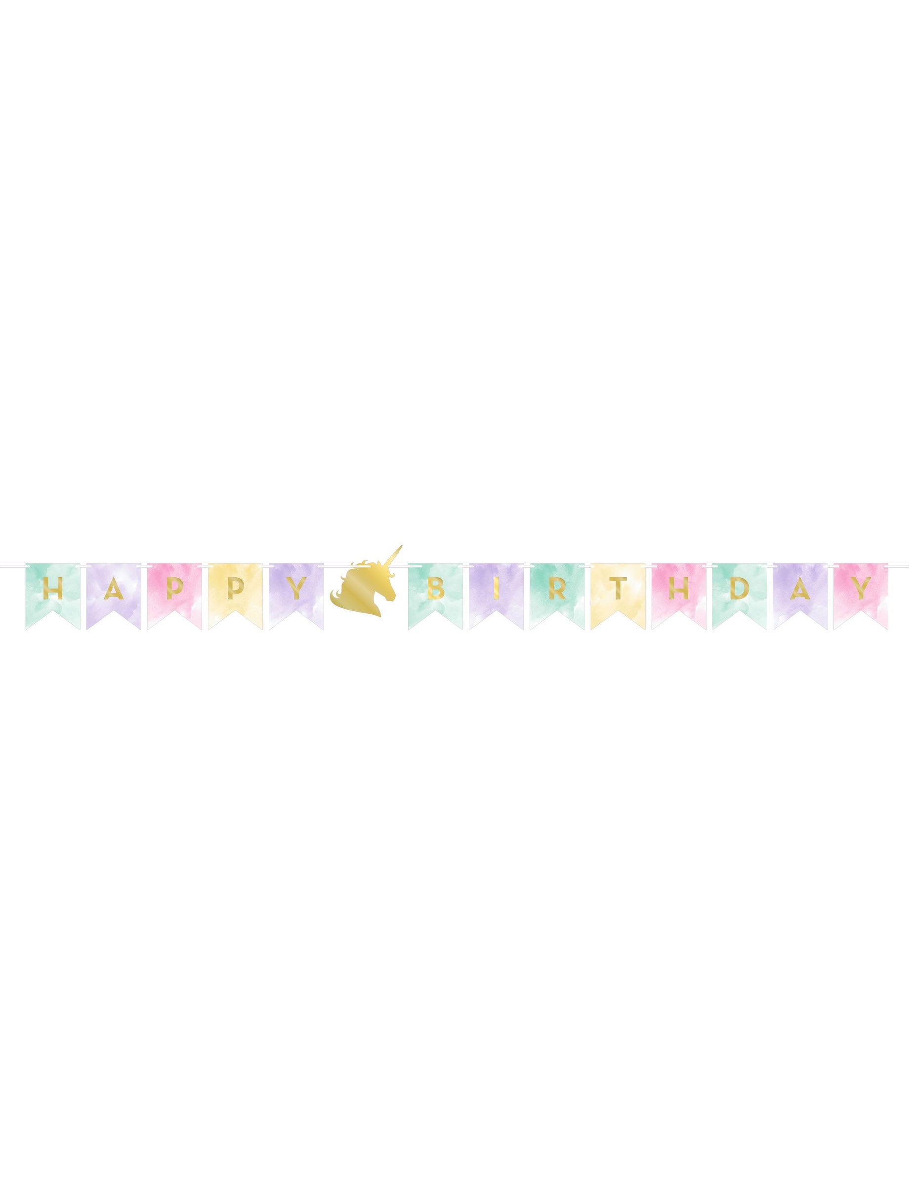 Sublimez votre décoration avec cette guirlande licorne d'une longueur totale de 2,4 mètres. Elle se compose de fanions en carton aux tons pastel affichant le message Happy birthday en lettres d'or. Une licorne dorée trône au milieu de la bannière, dont les éléments mesurent 14 cm de hauteur. Très simple à installer grâce à ses attaches, cette guirlande apportera une touche féerique au goûter d'anniversaire licorne de votre enfant.