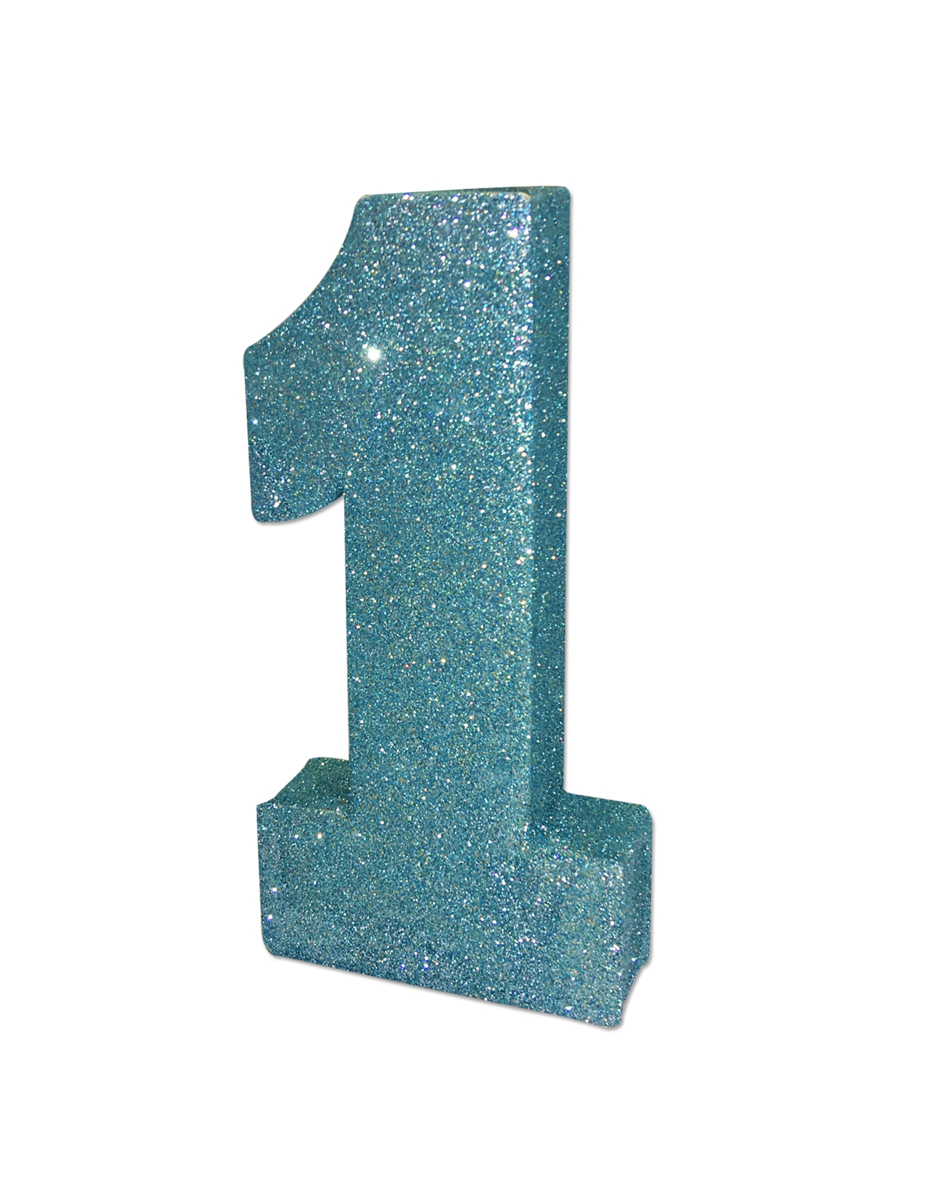 Trblietavá modrá stolová dekorácia s číslom 1 na 1. narodeniny