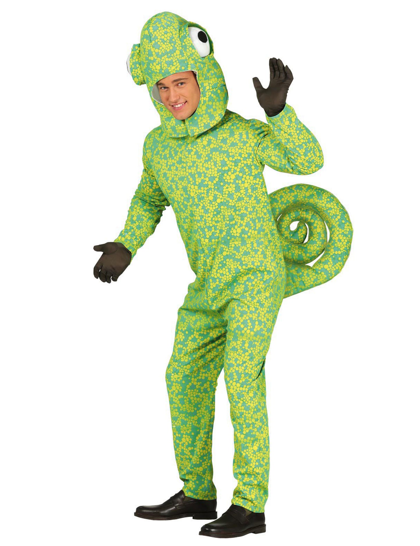 Tento kostým pre dospelých chameleónov pozostáva z kapucne a kombinácie. Zelená a žltá kombinácia má vytlačenú mašinicu. Chvost sa vyvaľal na seba, zdobí zadnú časť kostýmu. Hrubá penová kapucňa, ktorá predstavuje hlavu chameleónu svojimi výraznými očami, prináša posledný dotyk do oblečenia. Vaši priatelia vám volajú Chameleon! Smejte sa počas maskovaného večera tým, že vás transformujete touto vtipnou šelmou.