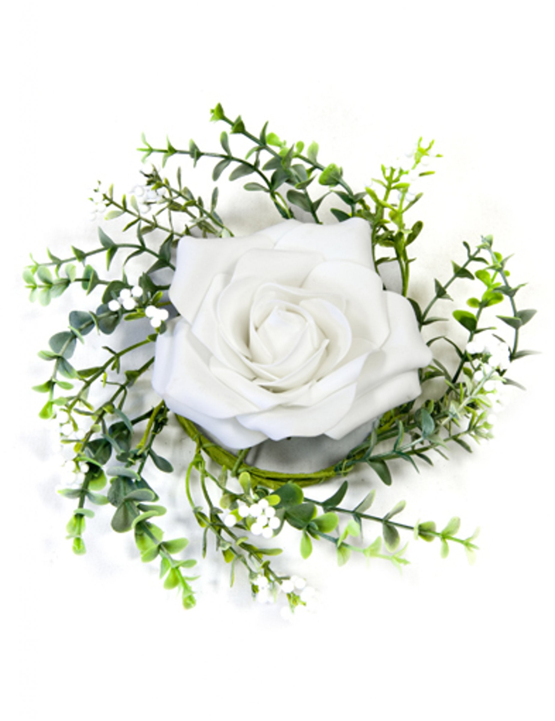 Toto stredový ornament z 18 cm Tento priemer je ideálnym doplnkom pre vaše udalosti. umelý kvet biela je obklopená zelenými listami a malými kvetmi, čím vytvára dekorácia stola úhľadné. Zlepší to vaše dekorácia stola počas svadba na vidieku alebo elegantnú recepciu.