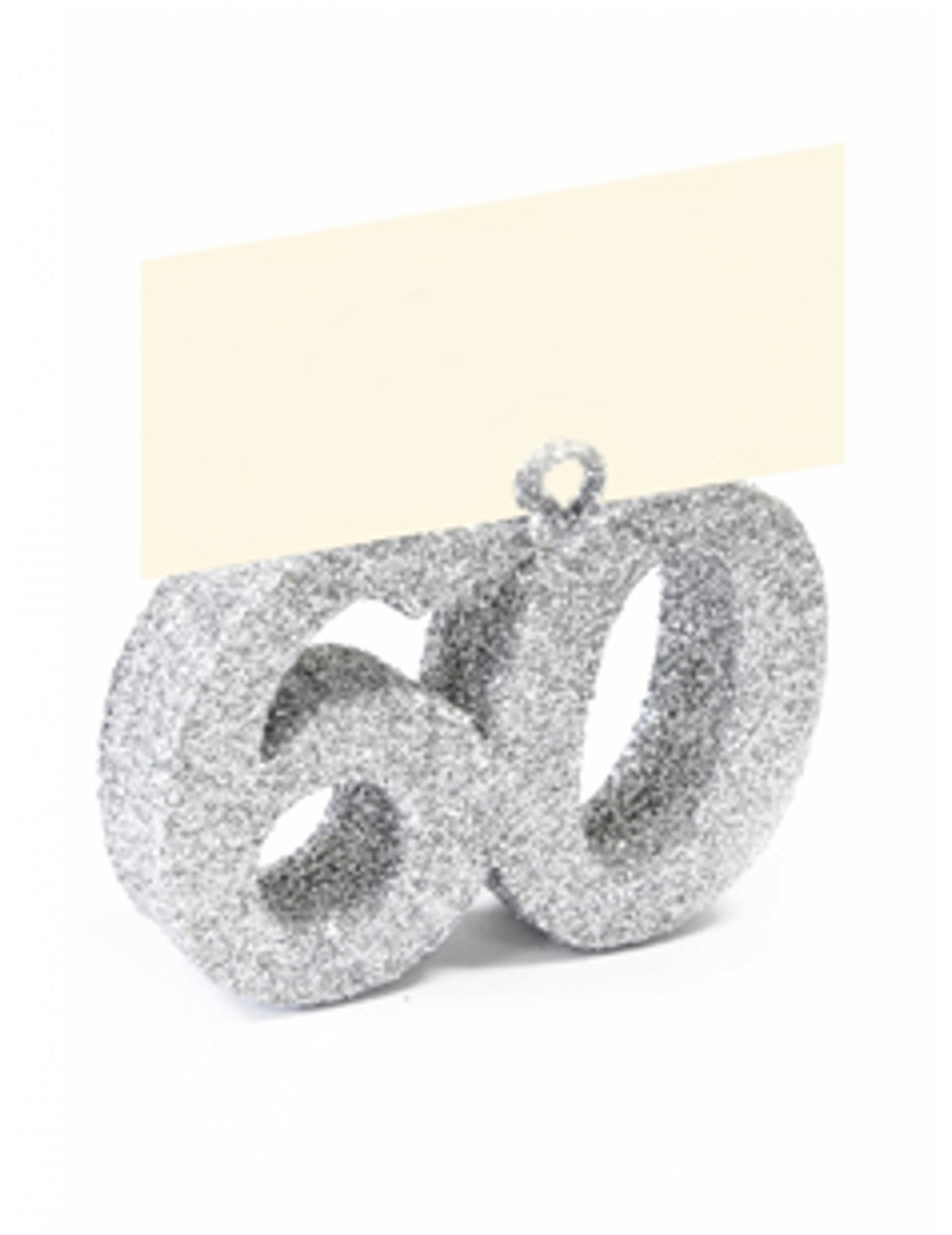 Urobte si s týmto párty nezabudnuteľnou karta s miestom šumivé zobrazovanie číslo 60Tento doplnok je vyrobený z polystyrénu a ozdobený striebornými trblietkami a má rozmery 4 x 4 x 1,5. cm. Praktické, toto polystyrénová umiestňovacia karta Súčasťou je kovová tyč na uchytenie menoviek. Je to základný prvok pre dekorácia stola úspešný počas 60. výročie nezabudnuteľné.