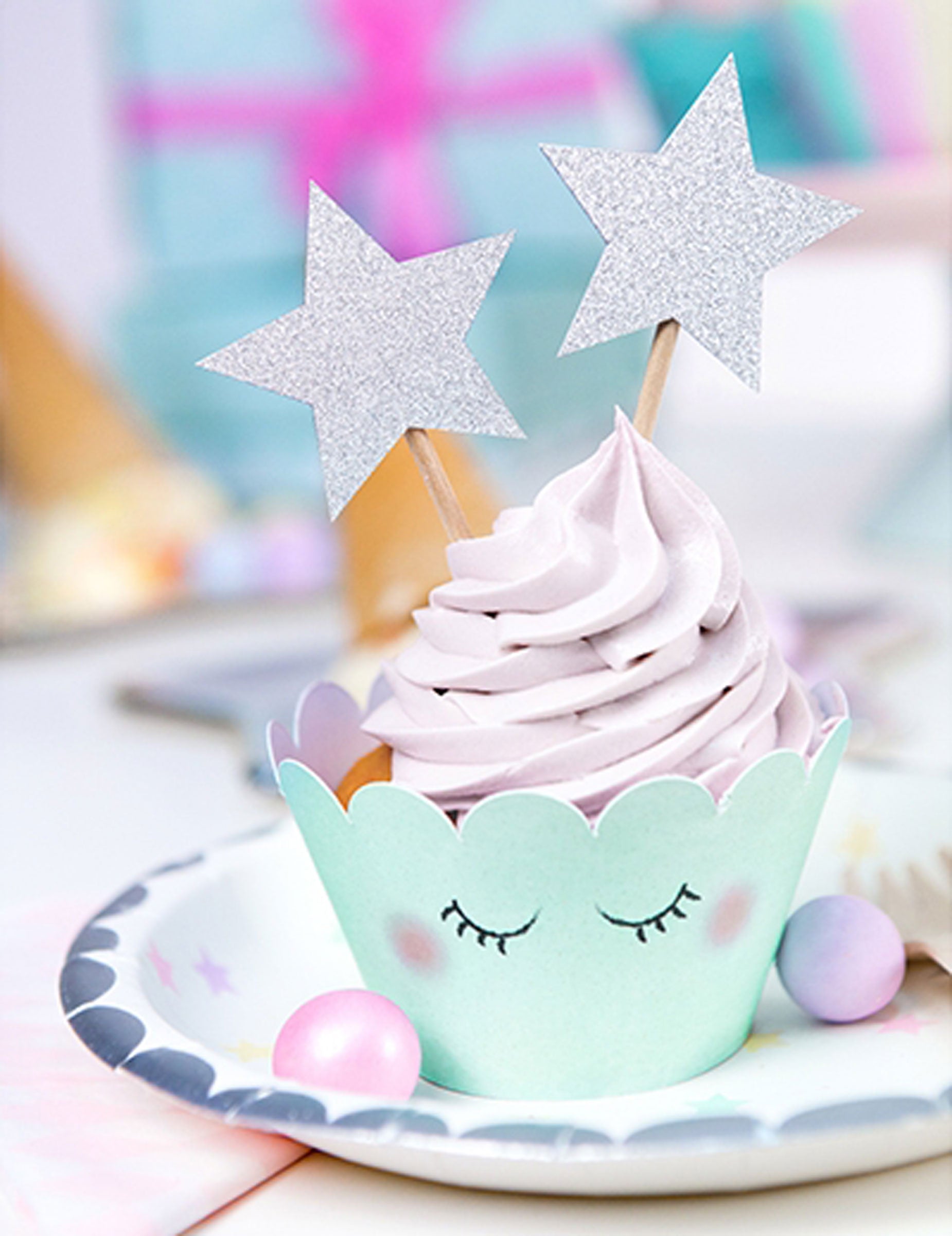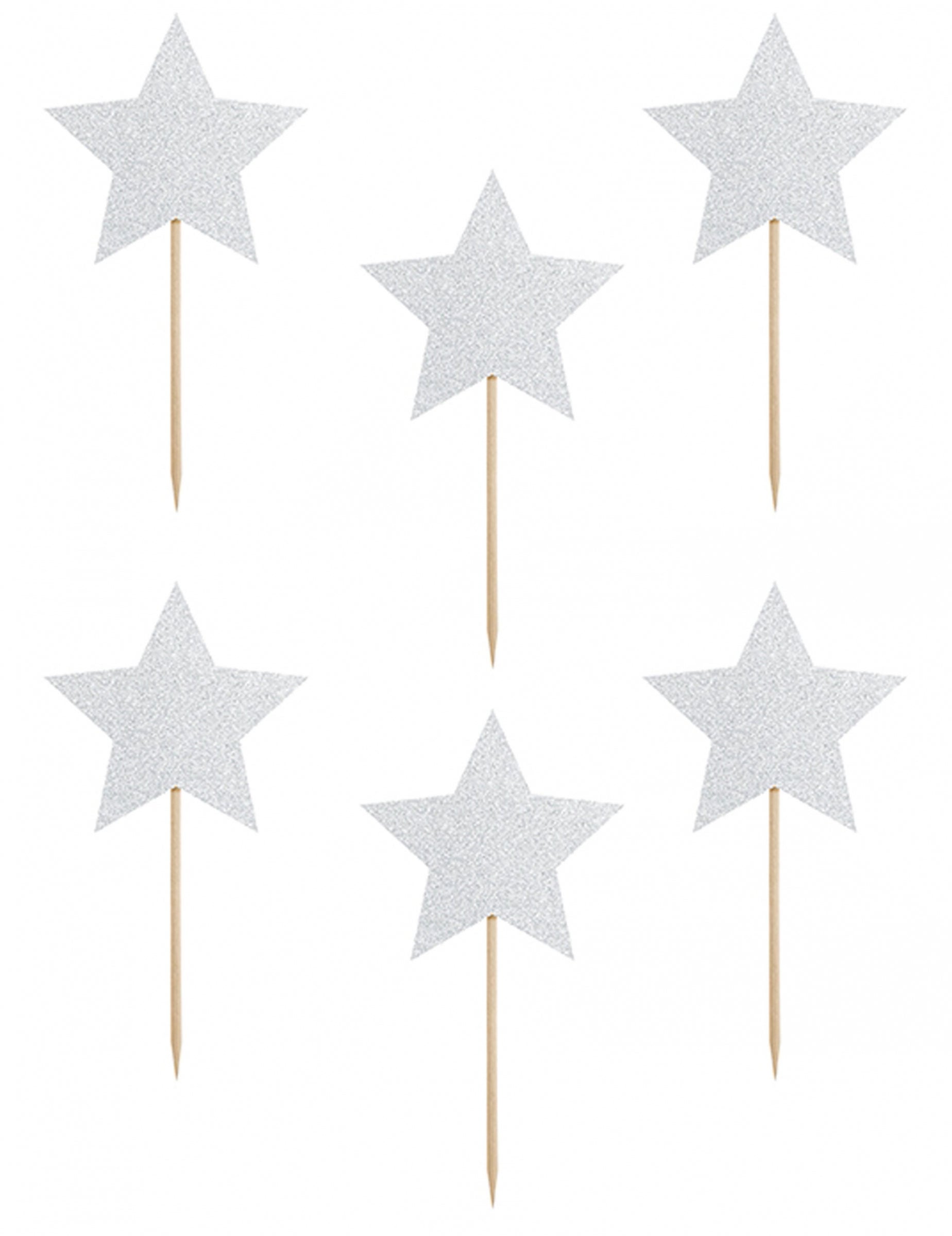 Dodajte svojim cukrárskym výtvorom nádych lesku s touto sadou 6 kusov ozdoby na tortuKaždá stonka je zakončená trblietavou hviezdou ozdobenou strieborný trblietIdeálne pre okamžitý slávnostný efekt. S celkovou výškou 11,5 cm, Tieto doplnky sa ľahko vkladajú do vašich dezertov. Tieto dekoratívne prvky sú ideálne na vylepšenie koláč počas narodeniny alebo akúkoľvek inú oslavu.