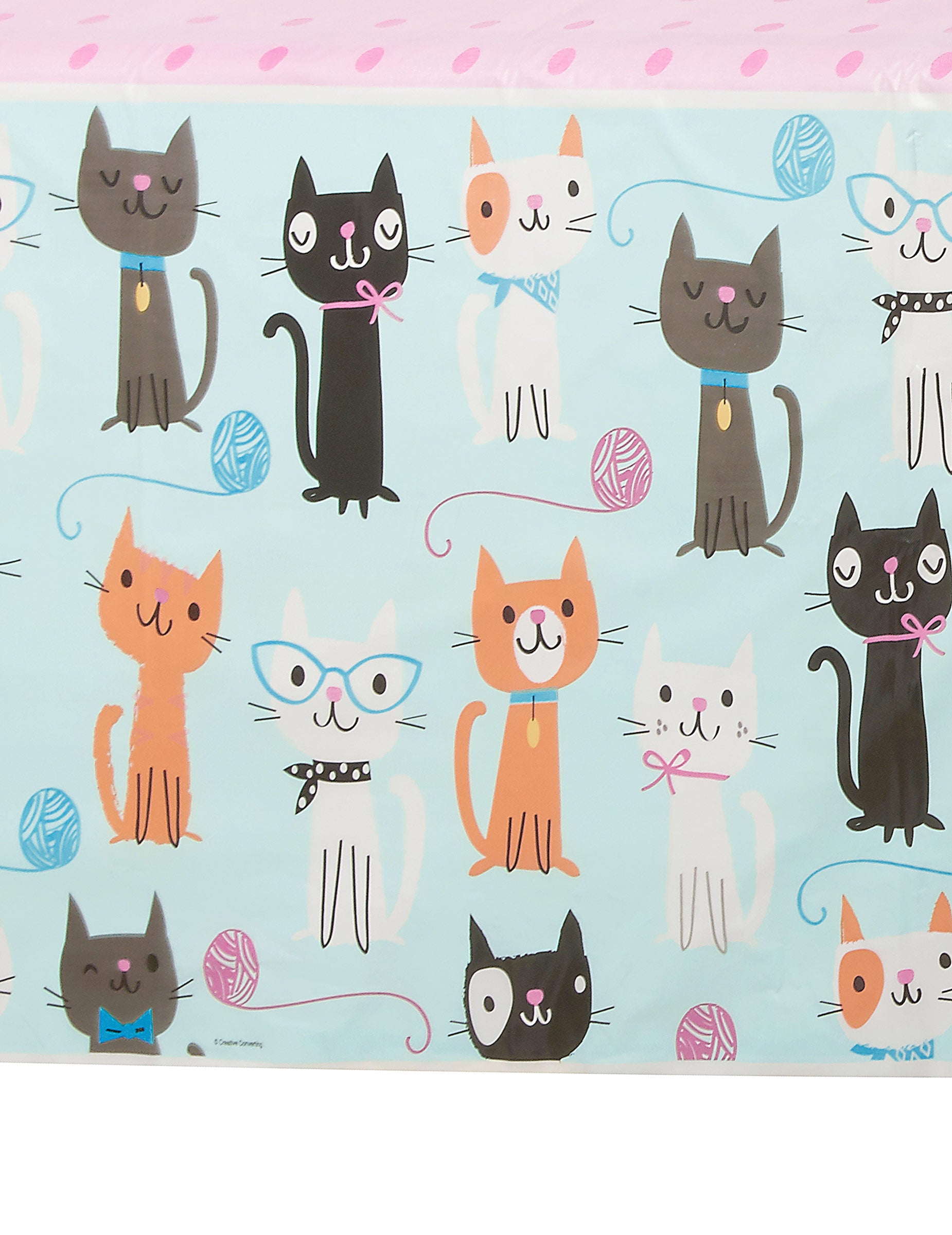 S rozmermi približne 137 x 259 cm, toto obrus Je vyrobený z odolného plastu. Má slávnostný ružový bodkovaný dizajn, ozdobený malými mačky Biele, sivé a červené deti sa hrajú s klbkami priadze na modrom pozadí. Tento chránič stola bude perfektný na vytvorenie veselej atmosféry počas...narodeniny vášho dieťaťa.