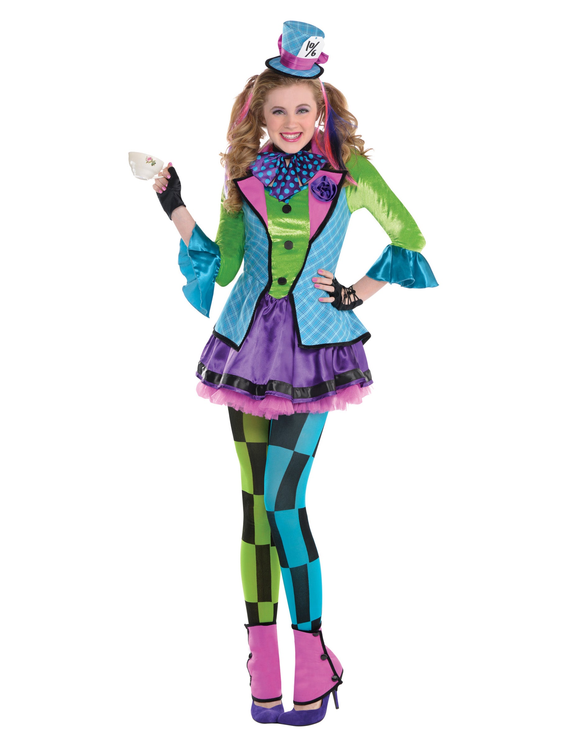 Toto viacfarebný kostým šialeného klobučníka Pre tínedžer Obsahuje šaty so sakom, čelenku, motýlika, pančuchy a návleky na nohy (topánky, poháre a rukavice nie sú súčasťou balenia).