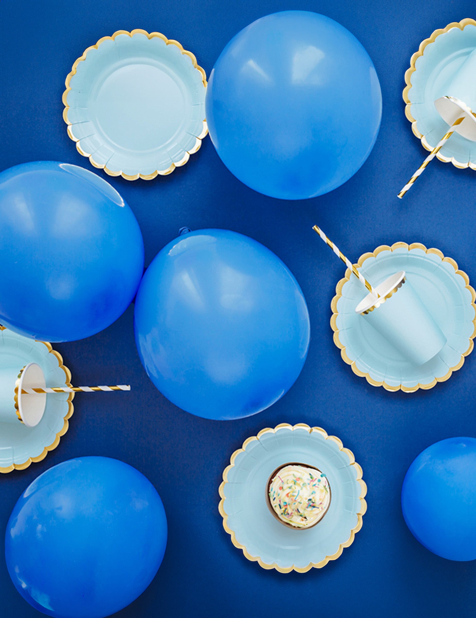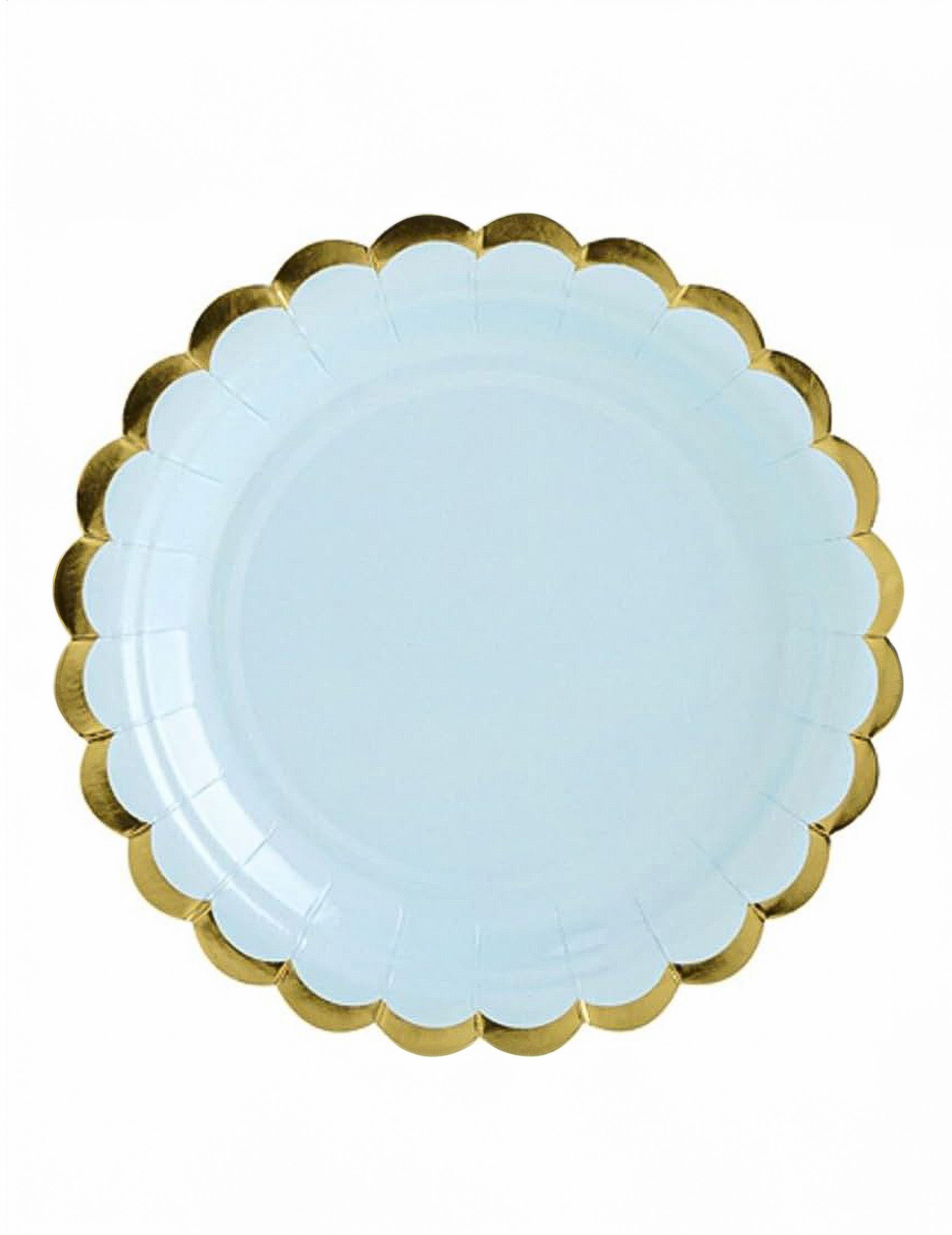 6 malých nebesky modrých kartónových tanierov so zlatým vrúbkovaným lemom 18 cm