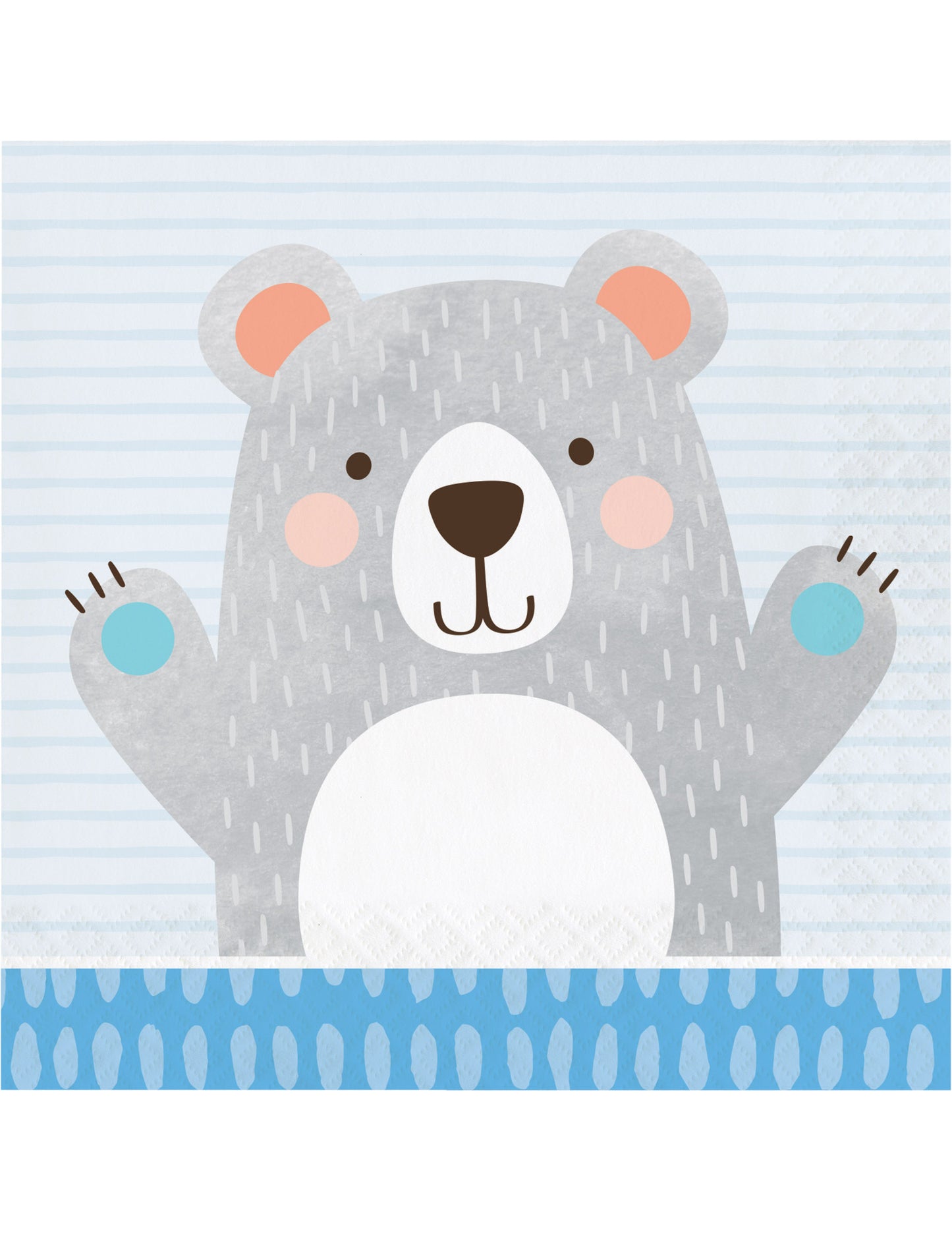 Táto šarža má 16 papierových utierok meraných 16,5 x 16,5 cm zložených a 33 x 33 cm po rozvinutí. Tieto uteráky sú zdobené celkom malým šedým medveďom. Spodok je svetlo šedá s pruhmi a spodná časť uterákov je modrá. S týmito uterákmi bude vaša narodeninová oslava alebo bábätko úspešné.