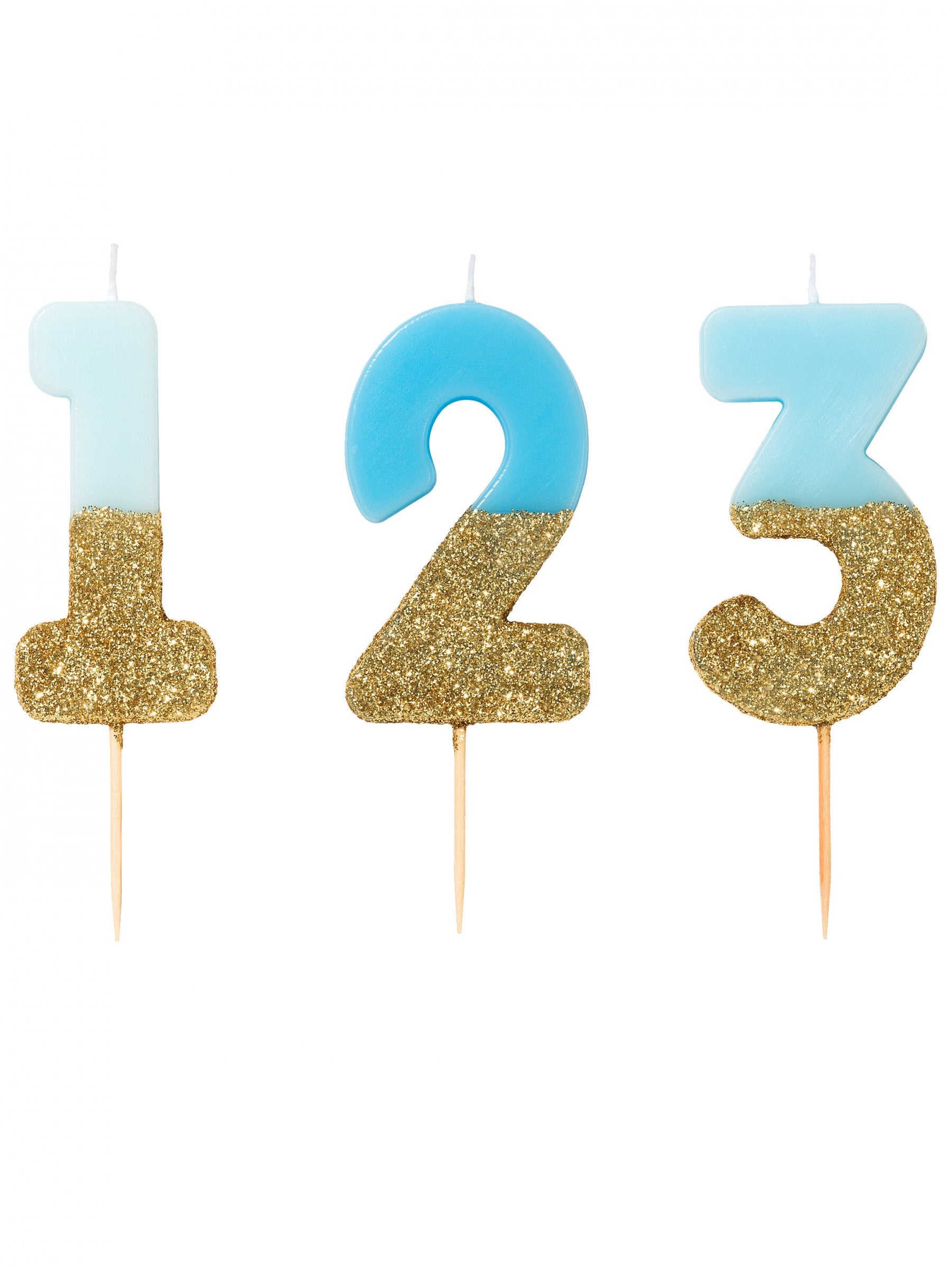 Sviečka na paličke s modrými a zlatými trblietkami, čísla 13,8 cm na tortu