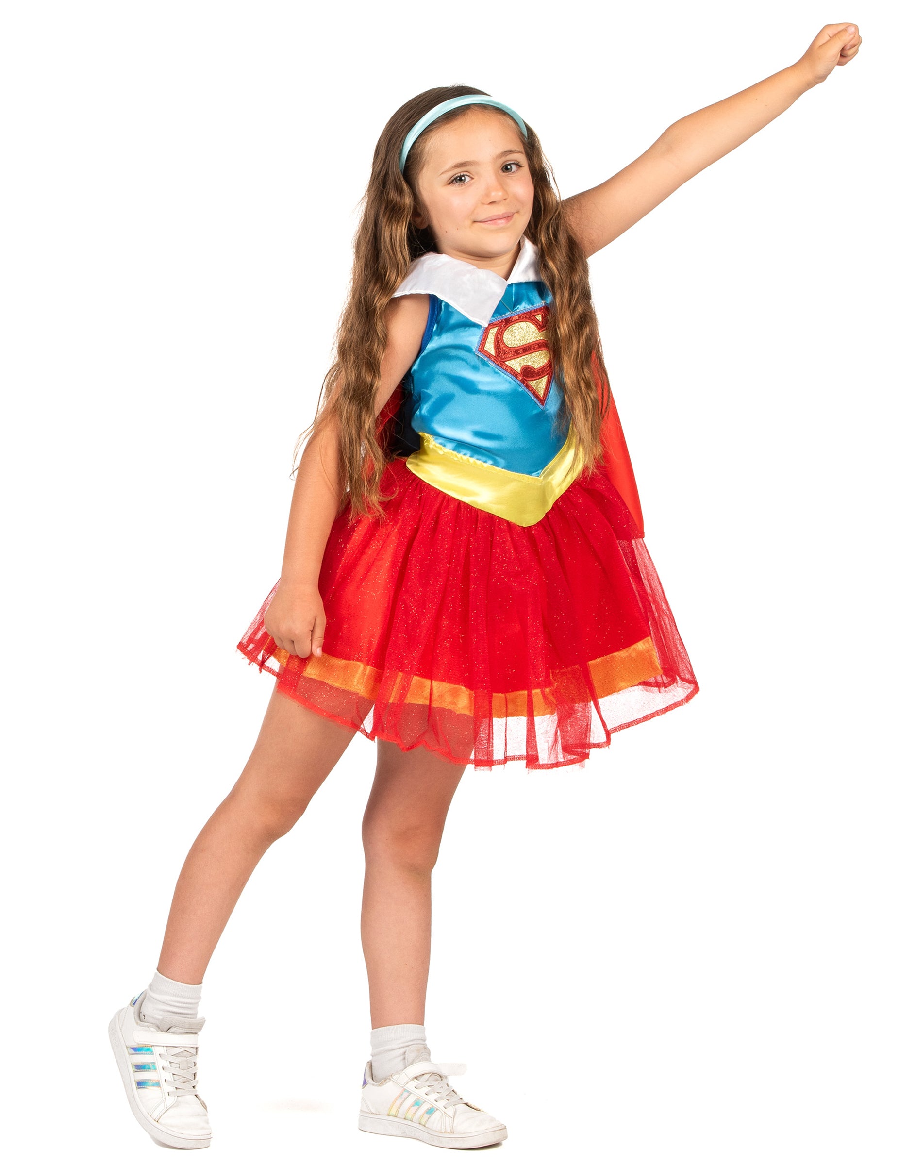 Tento kostým Supergirl je oficiálne licencovaný DC Super Hero Girls. Má šaty s mysom a čelenkou. Čelenka má svetlo modrú farbu. Bude perfektné nosiť na hlave! Krátke šaty bez rukávov sú saténové modré na poprsie s lesklým logom Supermana a Supergirl v strede hrudníka. Do šaty je šitý biely golier, rovnako ako krátky červený mys. Na šaty je tiež šitý žltý pás v tvare V. Nakoniec je spodná časť šaty trblietavý červený tul tul lemovaný červenou sukňou ohraničenou pruhom žltej látky. Tento kostým Supergirl, superhrdina z DC Super Hero Girls, poteší vašu dcéru počas karnevalu alebo superhrdinovou narodeninovou oslavou.
