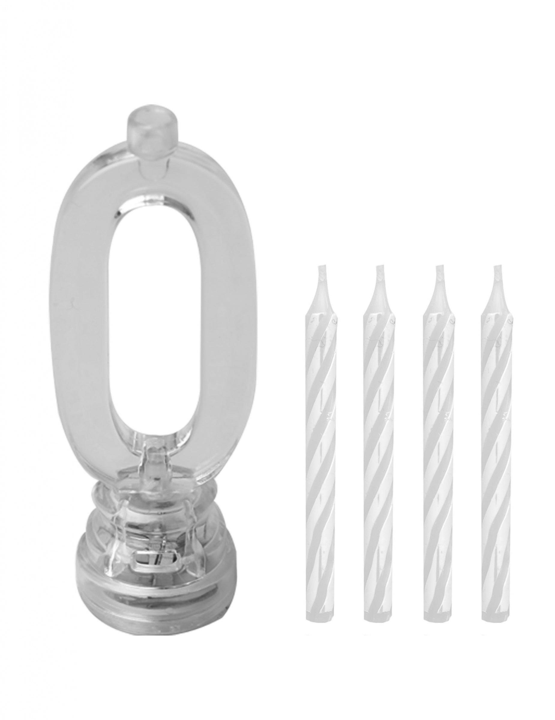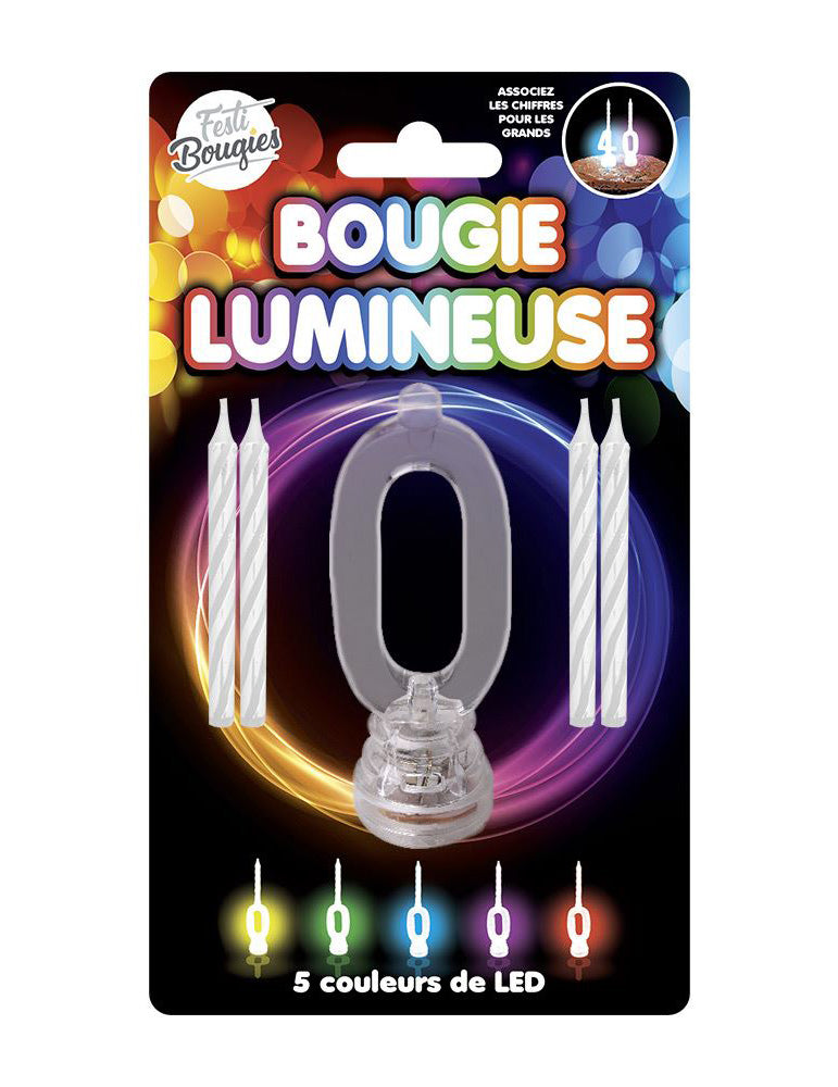 Táto časť pozostáva z 1 podpory a 4 voskových sviečok. Podpora je jasná a presmeruje číslo 0, môže zapáliť 5 rôznych farieb (žltá, zelená, modrá, ružová a červená). 4 sviečky sú klasické sviečky, ktoré môžete umiestniť na podporu. Táto jasná sviečka bude ideálna na priniesť dotyk originálnej farby k narodeninovému tortu!