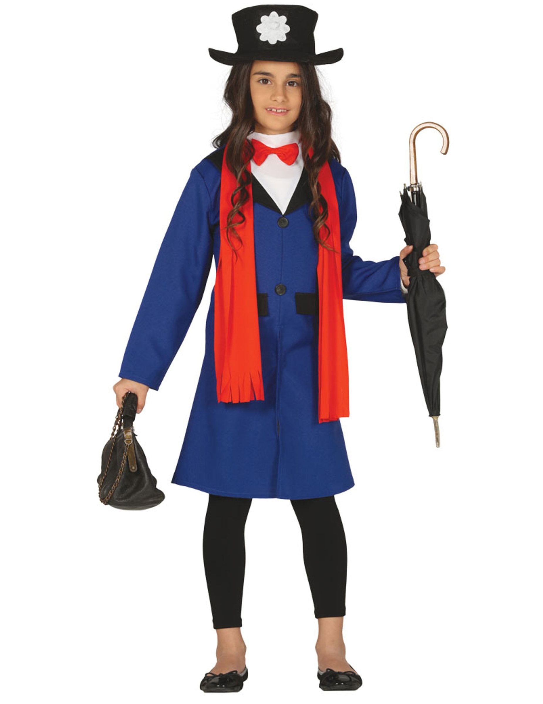 Toto Kostým anglickej zdravotnej sestry pre dievčatá Sada obsahuje bundu, šál a čiapku (taška, dáždnik, nohavice a topánky nie sú súčasťou balenia). Dlhá bunda je tmavomodrá s čiernym golierom a je doplnená dlhou červenou šatkou.