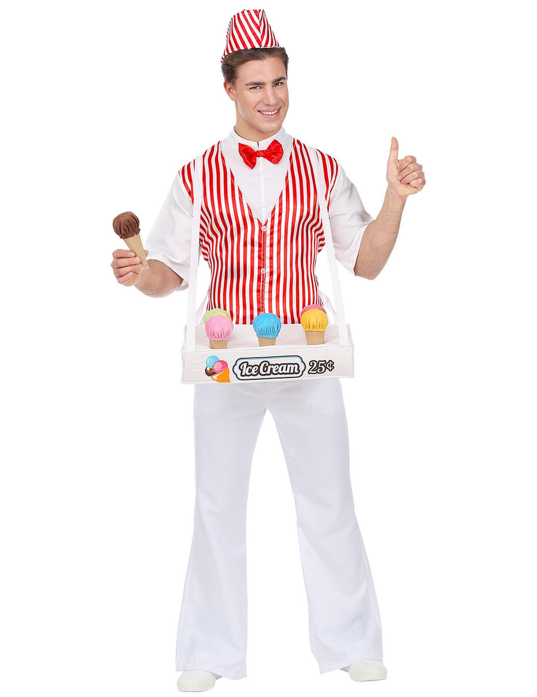 Krém na predajca kostýmov je pre mužov, pozostáva z košele s vestou, motýlením, klobúkom a kužeľovým podnosom so 6 kužeľmi zmrzliny. Košeľa je biela s falošnými bielymi a červenými pruhmi a falošnými priehľadnými pupienkami na prednej strane. Červená sa tiež nachádza na motýľovom uzle unavným spôsobom a na klobúku aj s bielymi a červenými pruhmi pripájajúcimi sa na falošnú vestu. Konečný podnos so 6 kužeľmi zmrzliny sa dodáva, aby sa dokonale doplnil kostým. Tento predajca zmrzliny bude ideálny pre maskovanú udalosť.