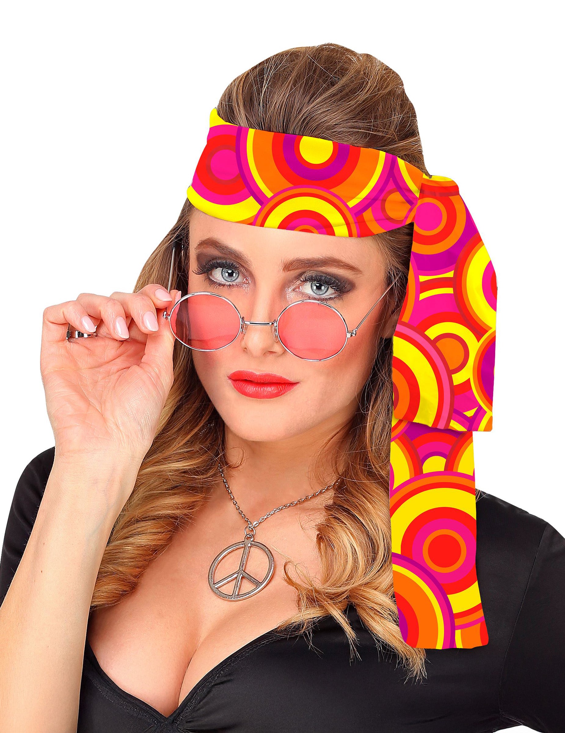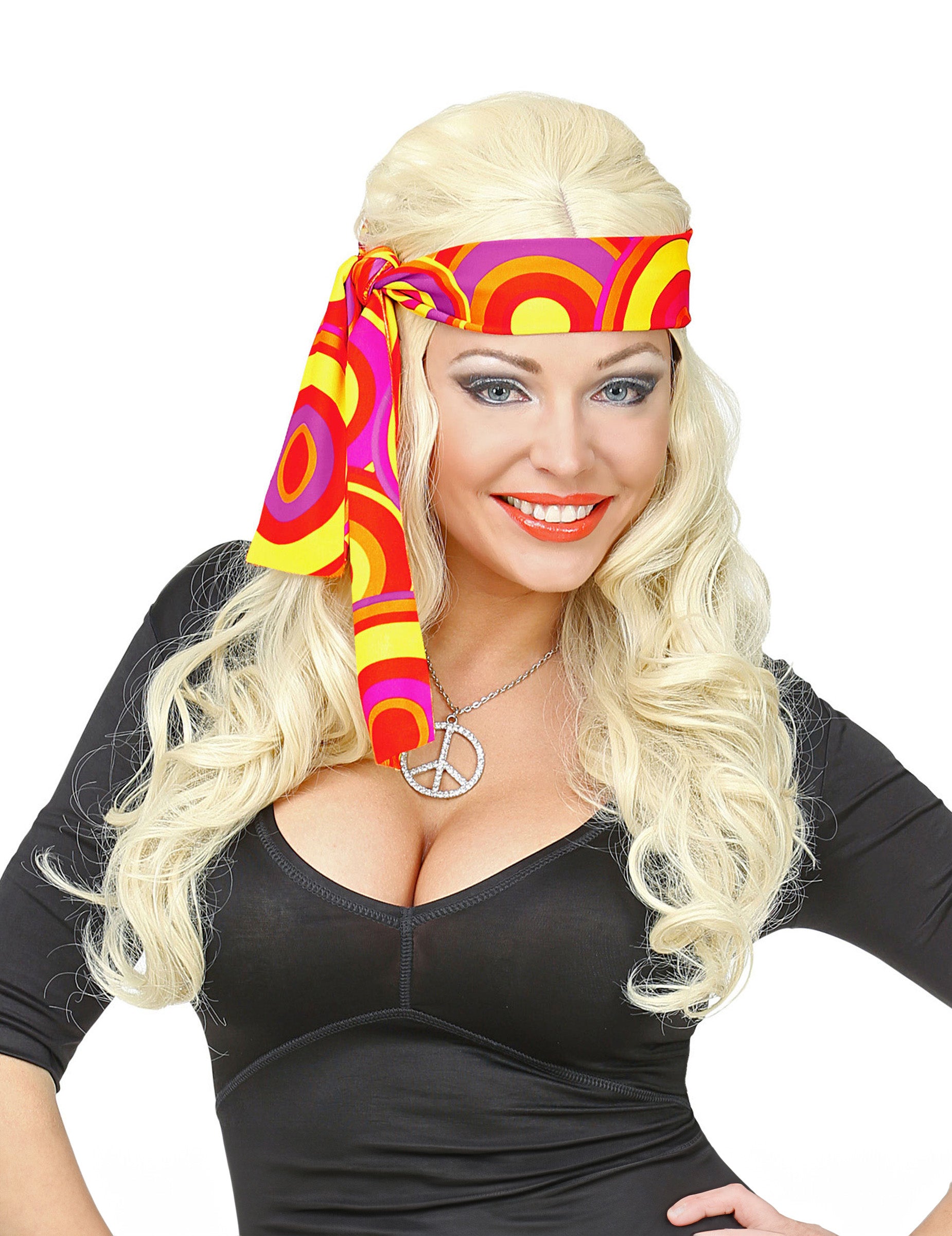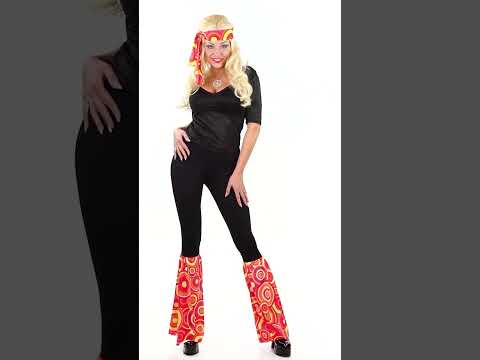 Tento 70. roky pre ženský banner je vyrobený v látke s okrúhlymi vzormi, žltými, oranžovými, červenými, červenými a fialovými. Jednoducho zviazal okolo hlavy. Tento banner bude ideálny na dokončenie diskotéky pri príležitosti karnevalu alebo večera v 70. rokoch.