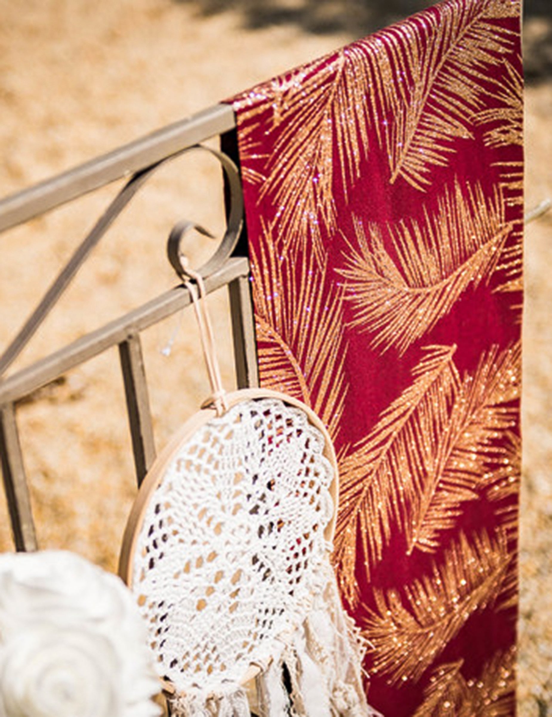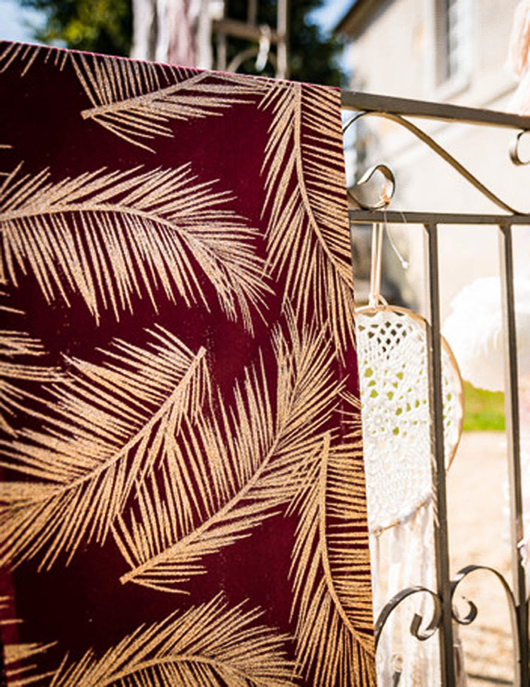 Zlepšite si príjem s týmto behúň na stôl z 28 cm na 5 m. Vyrobená z ľanu v odtieni marsala sa vyznačuje nádhernými paprade trblieta sa medenými odtieňmi. Veľmi praktické, dá sa narezať na požadovanú veľkosť, aby sa hodilo k vášmu nábytku. Toto behúň na stôl prinesie do vášho života exotického a rafinovaného ducha dekorácia stolači už ide o oslavu manželstvo alebo a narodeniny.