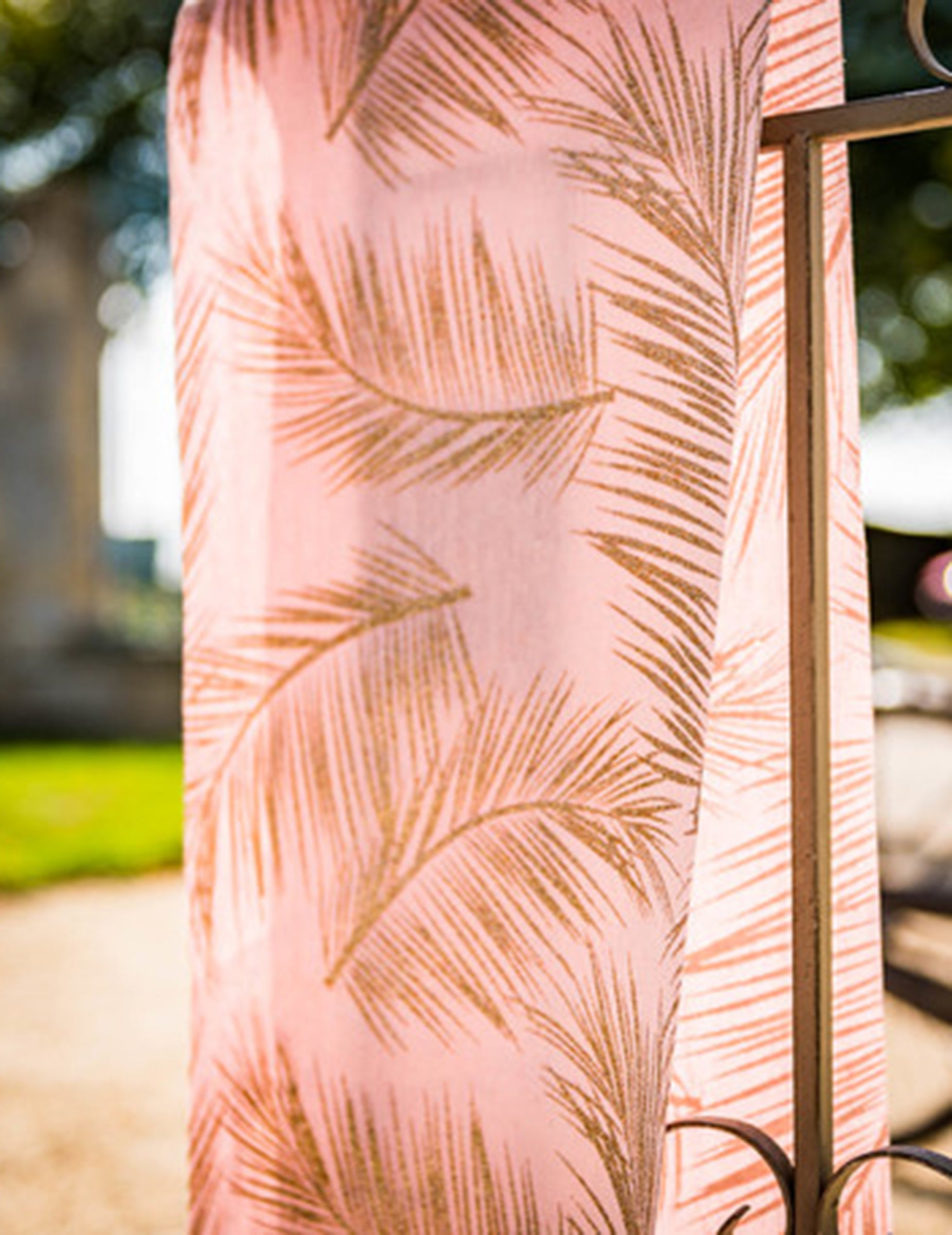 Toto behúň na stôl Vyrobené z ľanu, dodá vašej recepcii elegantný nádych. S rozmermi 28 cm Pri dĺžke 5 m má tento doplnok púdrovú ružovú farbu zvýraznenú vzormi paprade V zlatom prevedení s trblietkami. Veľmi praktický, dá sa narezať na požadovanú veľkosť, aby sa hodil k vášmu nábytku. Je to ideálny prvok na vytvorenie špeciálnej atmosféry. tropický šik počas manželstvo alebo a narodeniny slávnostné.