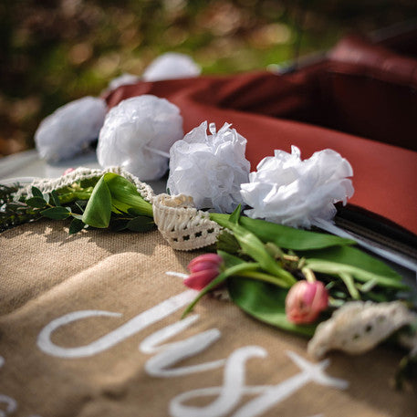 Toto Kompletná sada na zdobenie auta nevesty a ženícha dodá vášmu svadobnému sprievodu rustikálny a elegantný nádych.
