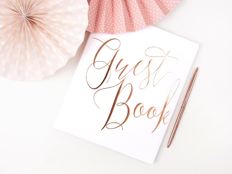 Vytvorte si s týmto nezabudnuteľnú spomienku na vašu udalosť kniha návštev 20 x 24,5 cm. Tento album s 22 prázdnymi stranami umožňuje vašim hosťom zapísať si svoje želania a odkazy. Jeho elegantný obal zobrazuje slová „Kniha hostí“ farebným... ružové zlato Zjemnený na čistom bielom pozadí. Tento krásny doplnok bude ideálnym doplnkom na doplnenie výzdoby... svadba z ružového zlata alebo akúkoľvek inú elegantnú oslavu.