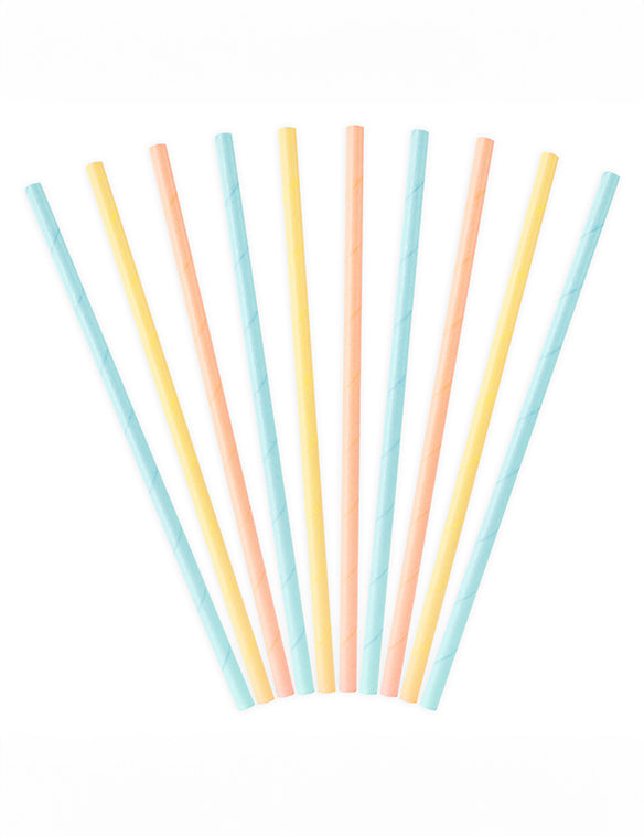 Táto sada obsahuje 10 pastelové slamky Vyrobené z kartónu. Každý kus má dĺžku 19,5 cm. cm, Dodávajú sa v troch farbách: 3 broskyňové slamky, 3 pastelovo žlté slamky a 4 nebesky modré slamky. slamky sú ideálne na ozdobenie pohárov a potešenie vašich hostí letný festival alebo a narodeniny tematické.