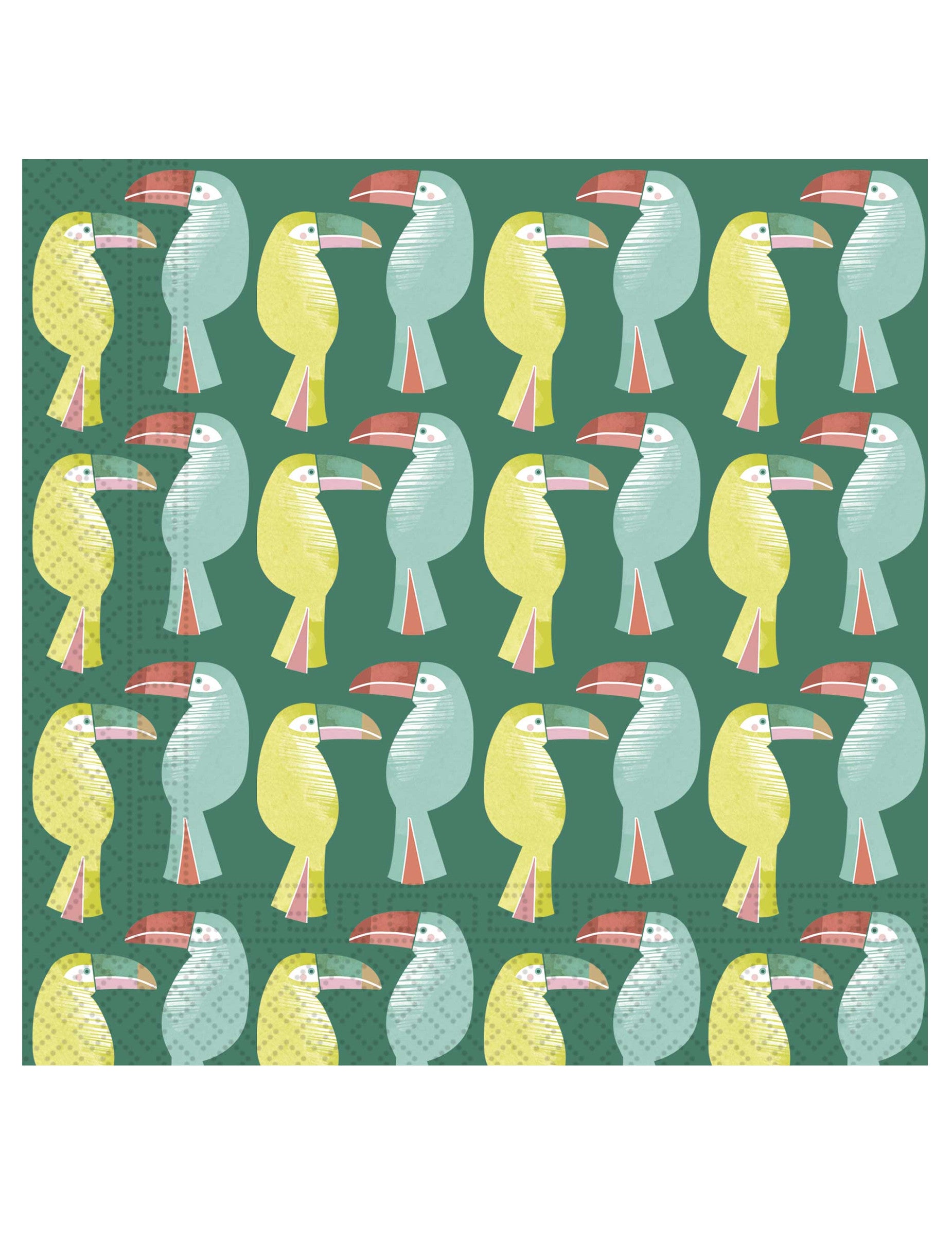Dodajte svojmu stolu nádych exotiky s touto 20-dielnou sadou uteráky jednorazové. Každý kus je ilustrovaný krásnymi tukany Viacfarebné, zasadené do prostredia zeleného lístia. Rozmery 33 x 33 cm po otvorení, tieto uteráky dokonale doplní vašu dekoráciu počas narodeniny alebo párty na téma džungle divoch.