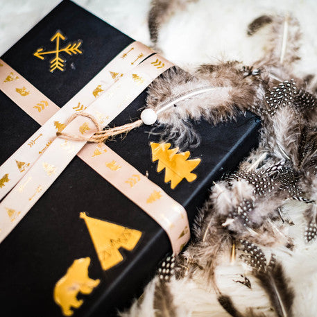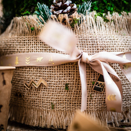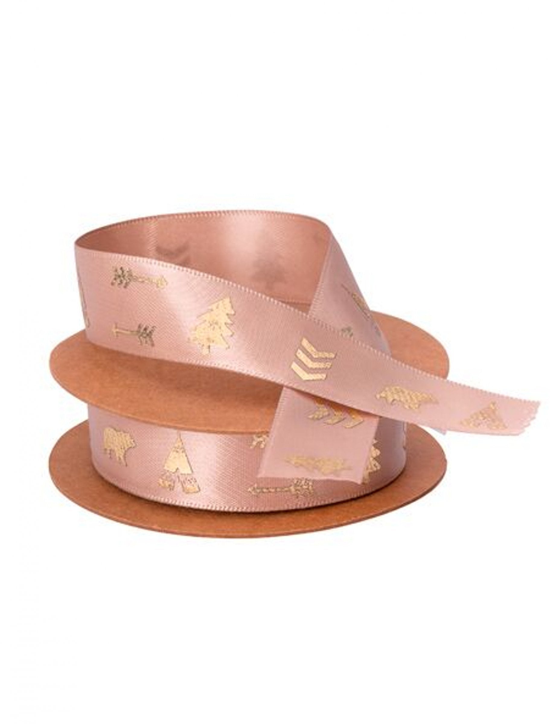 So šírkou 1,9 cm pre dĺžku 10 m, toto stuha Saténová látka má rafinovanú taupe farbu. Vyznačuje sa zlatými potlačami s motívom týpí, medveďov, šípov a jedlí. stuha Téma umožní integráciu atmosféry Indický les všetkým vašim dekorácie kreatívny.
