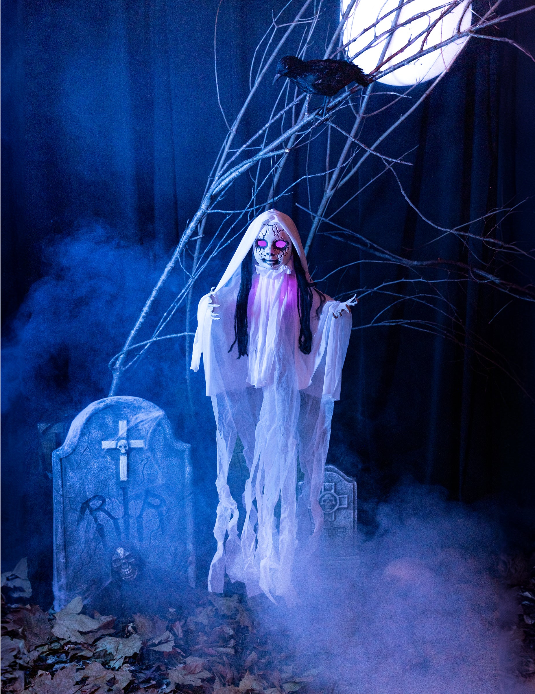 Táto dekorácia predstavuje strašidelnú bábiku. Meria približne 100 x 70 cm. Má sivú tvár s čiernymi trhlinami. Na oboch stranách tváre sú prítomné falošné čierne vlasy. Táto bábika má tiež kostrové ruky. Má systém, ktorý vám umožní rozsvietiť ho (batérie nie sú zahrnuté). Toto bude perfektné na dokončenie vašej výzdoby na večer Halloween.