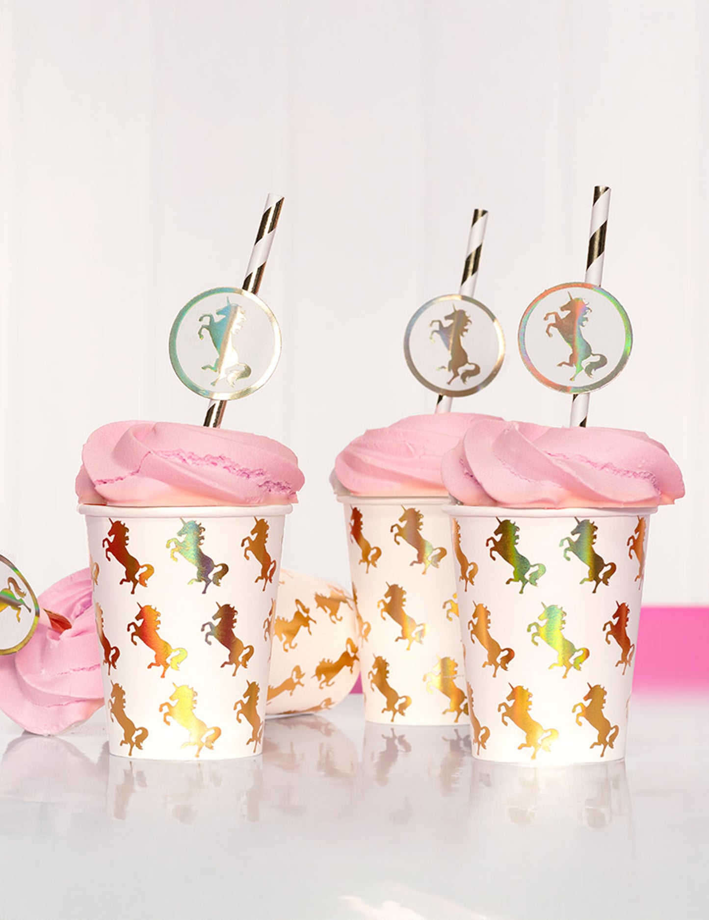 Táto časť má 10 holografických kartónových holografických škriatkov. Môžu obsahovať až 25 cl studených nápojov. Tieto šálky sú biele s peknými zlatými jednorožcami s dúhovými odrazmi. Tieto šálky budú ideálne na elegantné a elegantné narodeniny na tému jednorožcov.