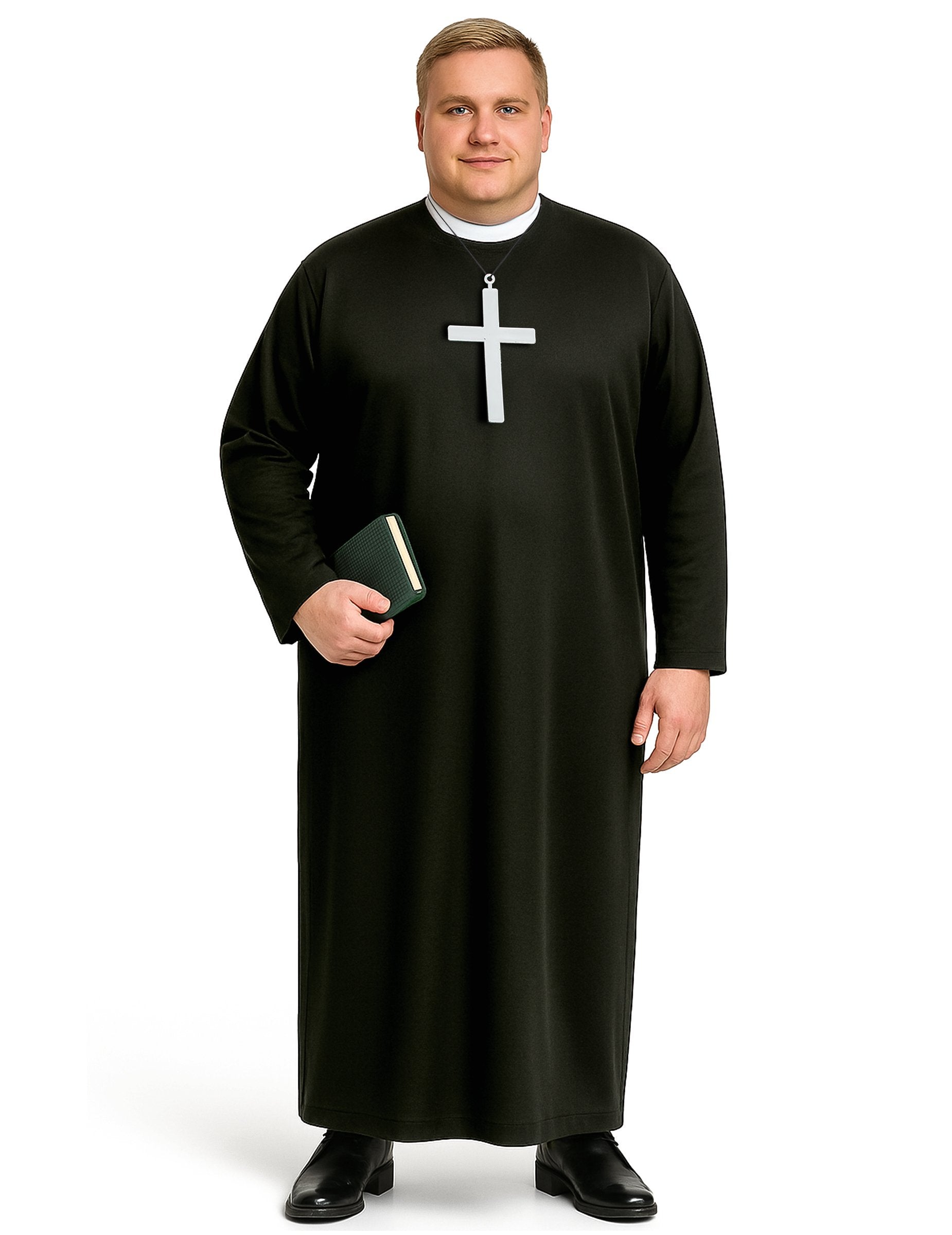Kostým tohto veľkého kňaza je pre mužov. Skladá sa z šaty (obojok a kniha nie sú zahrnuté). Dlhé šaty sú čierne, s bielym golierom. V hornej časti chrbta je poškriabanie, aby sa šaty ľahko zatvorili. Toto maskovanie bude ideálne pre karneval alebo večer maskovaného s priateľmi.