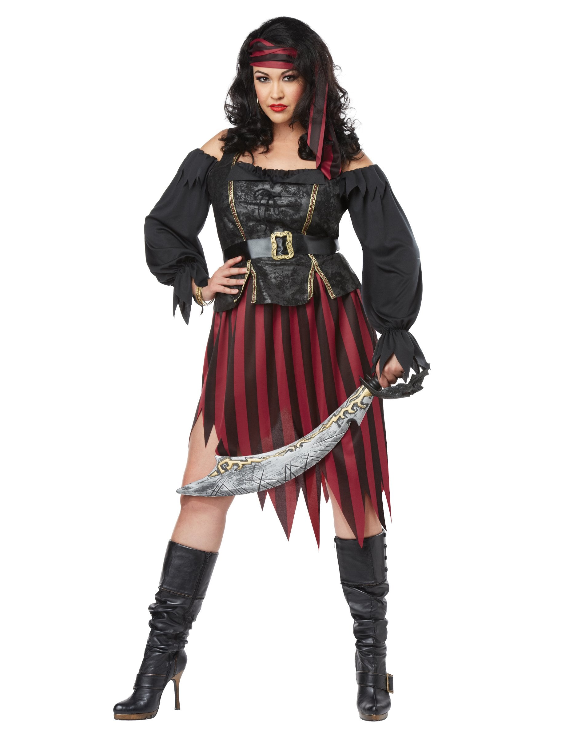 Toto veľké, veľké pirátske maskovanie má top, sukňu, pás a čelenku (topánky a šperky nie sú vrátane). Horná časť je čierna. Na úrovni poprsie sa nachádza v čiernej tkanine ASPEKTUM ZLATÝCH SOLES. Rukávy sú široké a uvedené podľa eLlaktiky pre nafúknuté efekty. Konce rukávov sú tiež rezané v bode pre vzhľad chlopne. Zahrnutý je aj imitačný kožený pás so zlatou obdĺžnikovou slučkou. Sukňa je assymetrická a okraje sú v bode vyrezané. Nakoniec, pre ďalšie podrobnosti, je prítomná čelenka s sukňou. Tento pirátsky kostým pre ženy bude ideálny pre karneval alebo večer na tému pirátstva.
