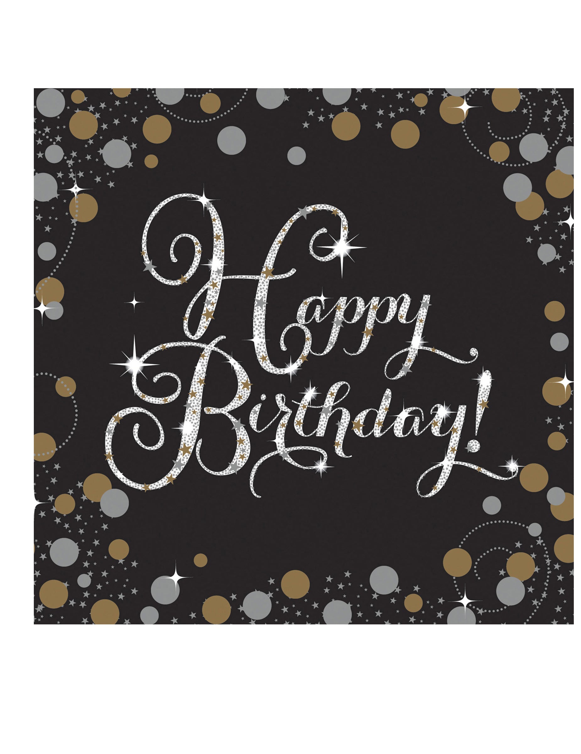 Dodajte svojmu prestieraniu štipku trblietky s touto sadou 16 **trblietavých slávnostných obrúskov**. Vyrobené z papiera, majú rozmery 33 x 33 cm. cm Po otvorení je ich elegantný čierny dizajn ozdobený zlatými a striebornými konfetami, ktoré obklopujú nápis „Happy Birthday“ v strede. Tieto **trblietavé oslavné obrúsky** sú ideálne na dodanie trblietavého nádychu vášmu **trblietavému narodeninovému jedlu**.