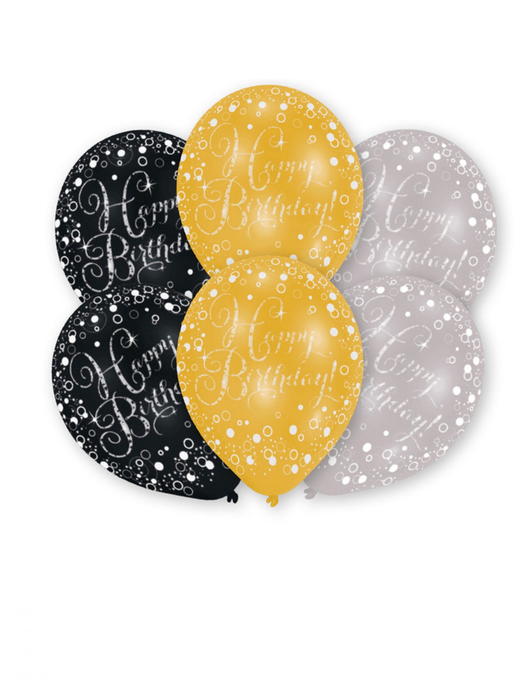 Vylepšite si párty dekorácie touto sadou 6 kusov trblietavé oslavné balónyVyrobené z odolného latexu, merajú približne 27 cm V nafúknutom stave sú vysoké. Ich čierna, zlatá a strieborná farba v kombinácii s nápisom „všetko najlepšie k narodeninám“ dodá vašej udalosti elegantný a slávnostný nádych. Tieto kúsky sú ideálnym doplnkom na... osláv svoje žiarivé narodeniny s eleganciou.