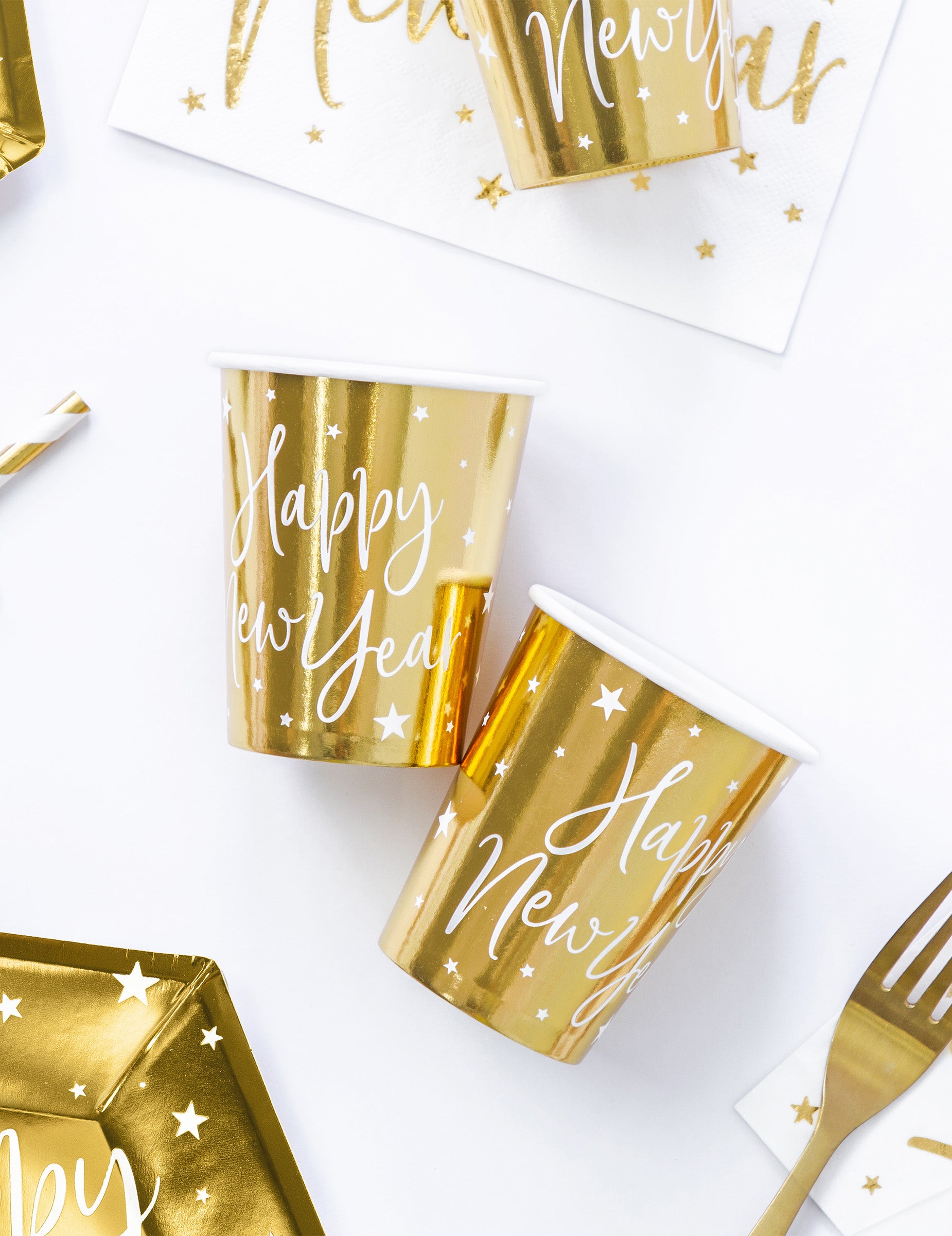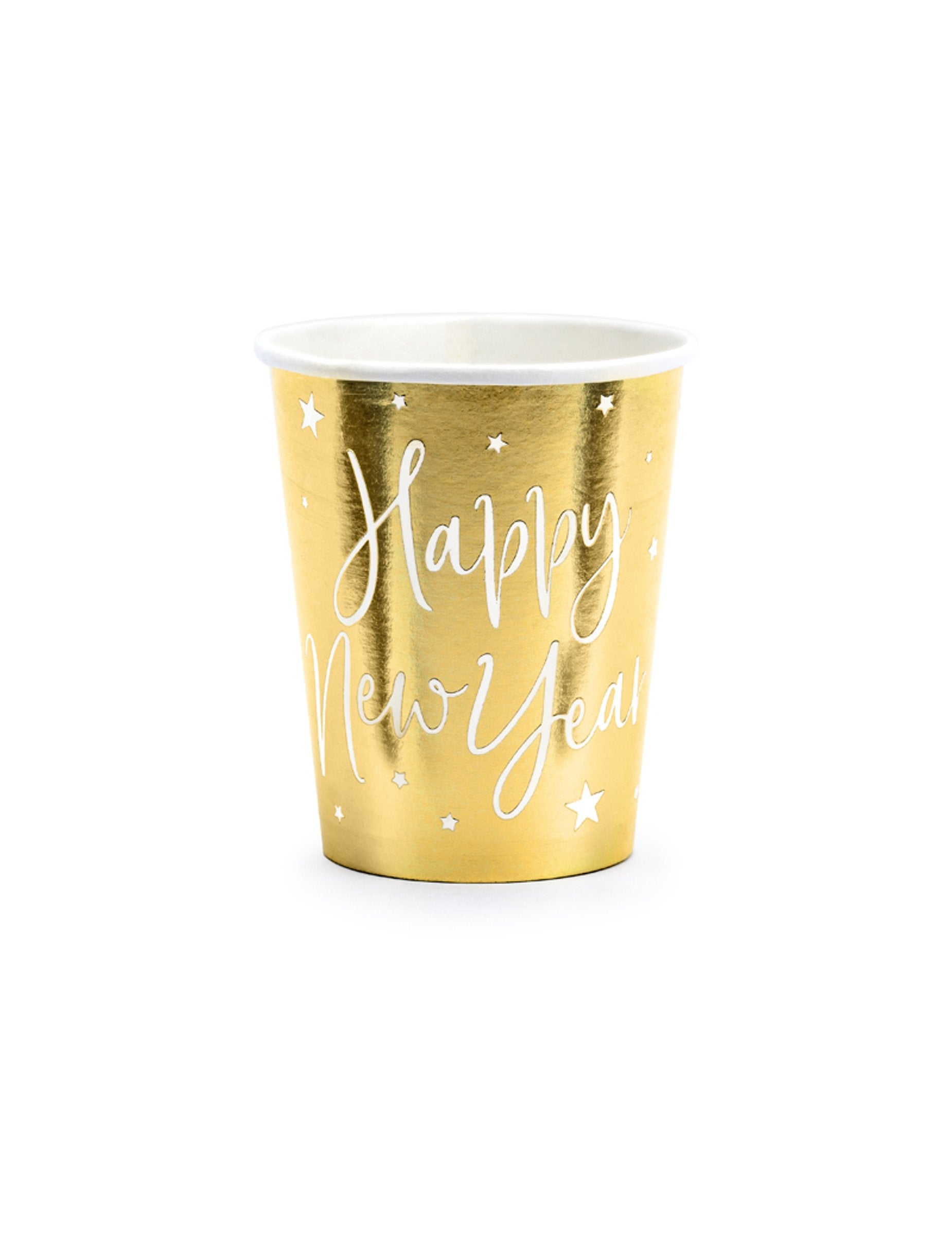 Vylepšite si párty dekorácie touto sadou 6 kusov šálky kartónové fľaše s objemom približne 220 ml. S elegantnou metalickou zlatou povrchovou úpravou sú zdobené jemnými hviezdičkami a nápisom „ Šťastný nový rok! v kontraste s bielou farbou. Tieto šálky sú ideálnym doplnkom, ktorý prinesie elegantnú a iskrivú atmosféru k vášmu stolu. Nový rok.