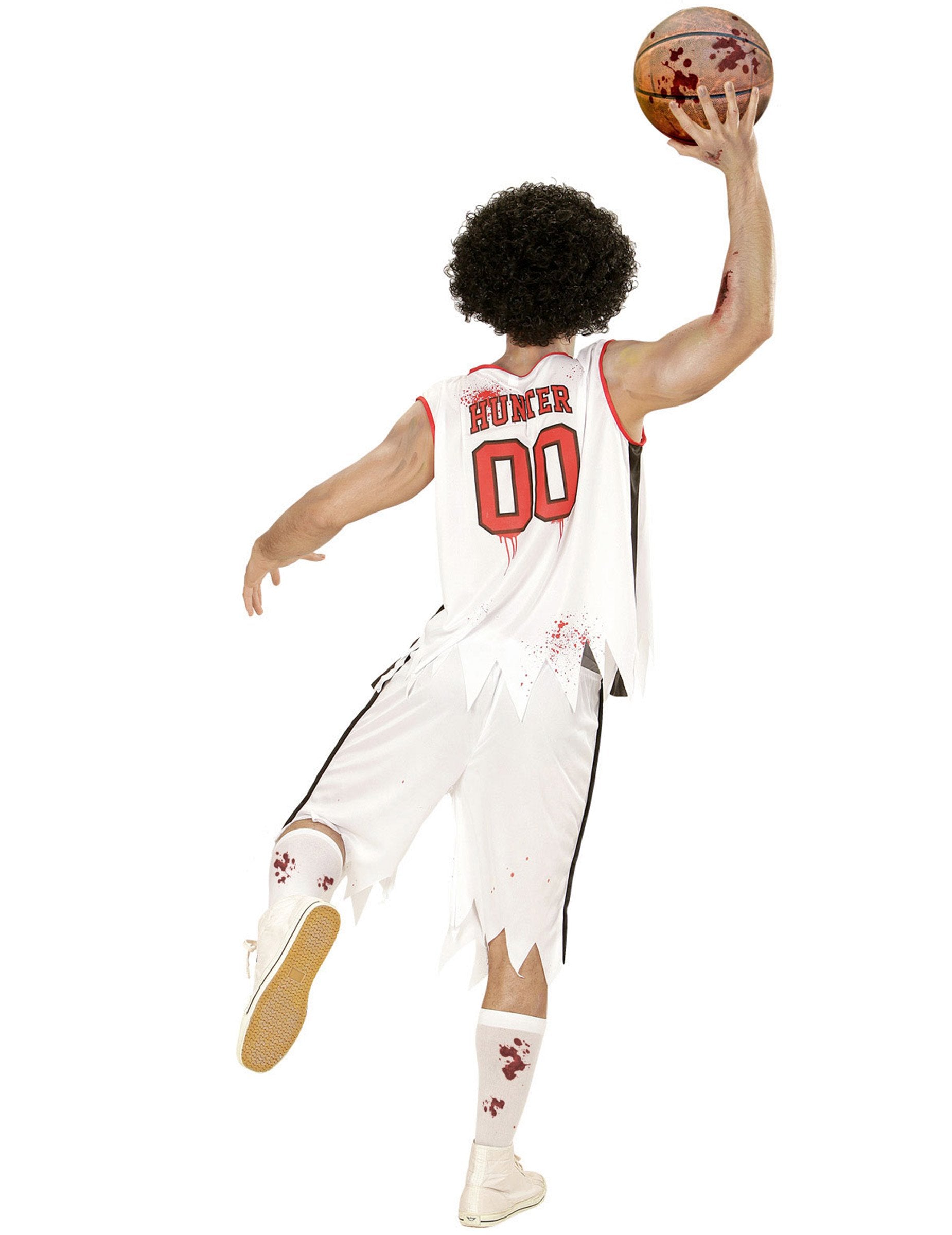 Tento maskovací hráč zombie basketbalového hráča je určený pre mužov, pozostáva z nádrže, ako aj z kraťasov (lopta, ponožky, parochne a tenisky, ktoré nie sú vrátane). Horná hranica je biela s tlačou „Blood 00“ na prednej strane a „Hunter 00“ vzadu. Tento je zafarbený krvou, aby sa priniesla realistická stránka kostýmu. Na úrovni hornej časti hornej časti nádrže je červený okraj prítomný s čiernym pásom na každej strane hornej časti nádrže. Šortky sú tiež biele s krvnými škvrnami a čiernymi pásmi na každej strane. Tieto šortky sú v páse elastické pre väčšie pohodlie. Vrchná časť nádrže, ako aj šortky končia v Sawtooth. Tento kostým bude dokonalý pri príležitosti maskovanej párty alebo na Halloween.