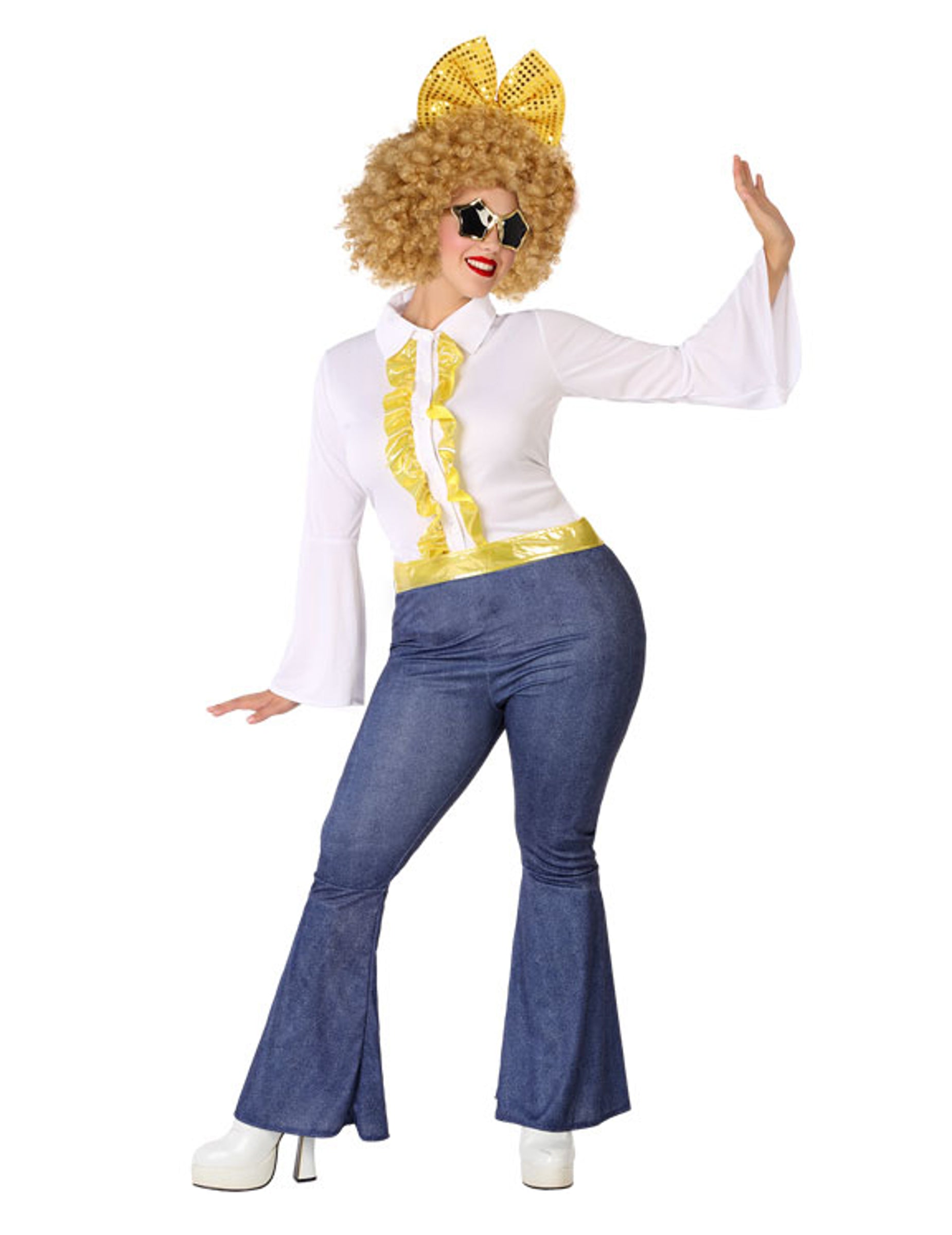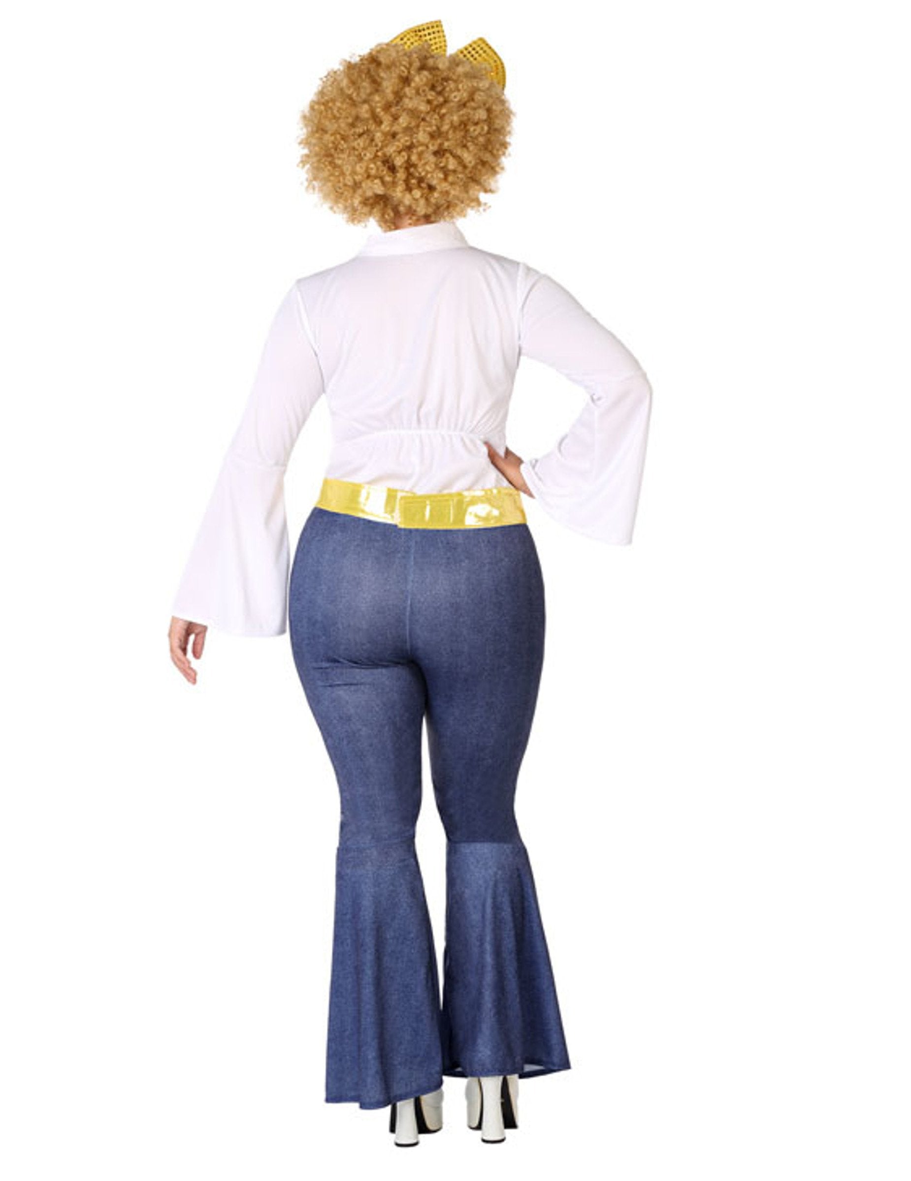 Tento disco kostým vo veľkej veľkosti pre ženy sa skladá z vrchného dielu, opasku a nohavíc (parochňa, mašľa, okuliare a topánky nie sú súčasťou balenia). Vrchný diel je biely s dlhými rukávmi, so žltými volánmi po oboch stranách zapínania.