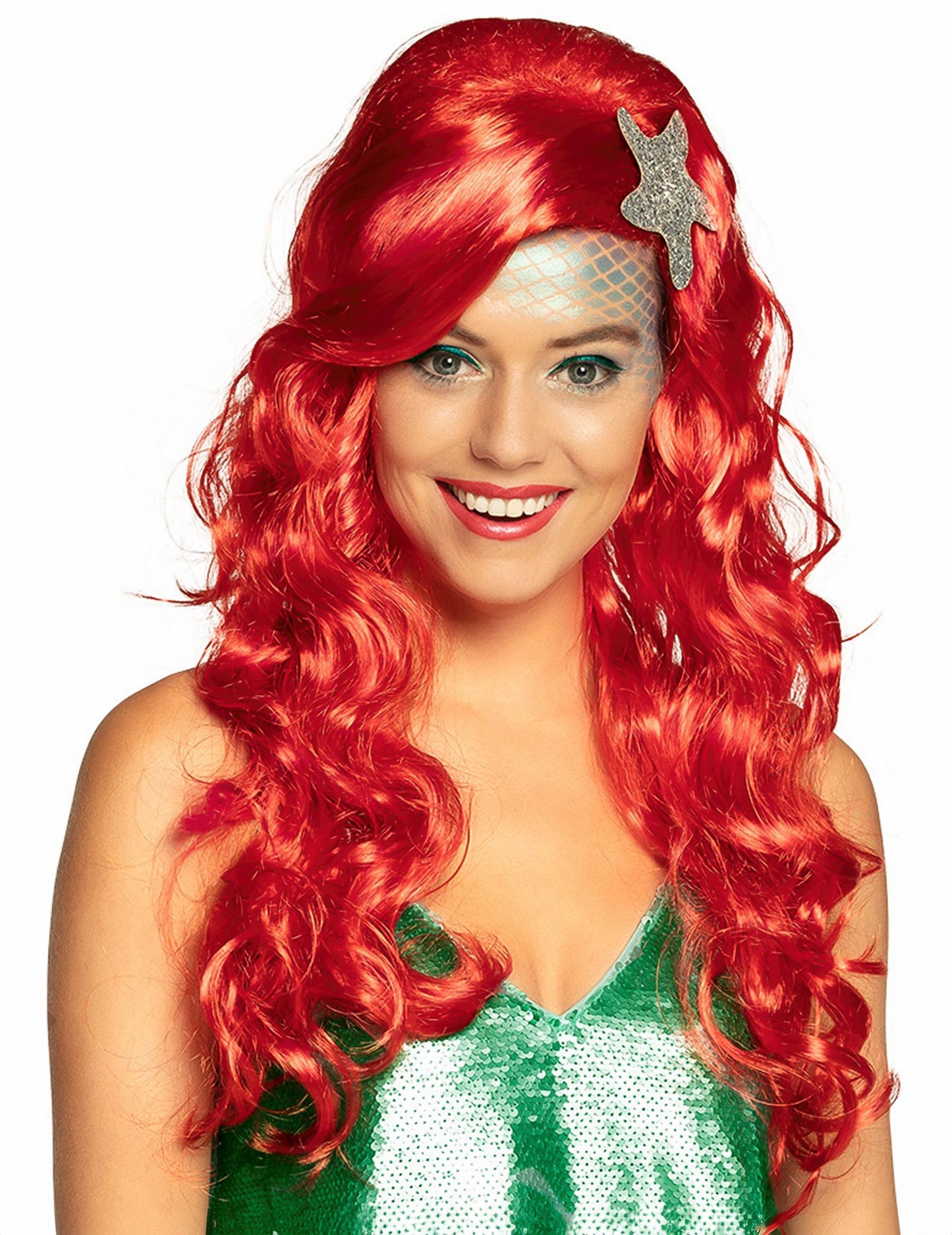 Táto parochňa červenej morskej panny je pre ženy. Je vyrobený z dlhých zvlnených červených syntetických vlasov. Na jednej strane je prítomná pekná hviezda. Táto pekná parochňa bude ideálna na stelesnenie peknej malej morskej panny počas karnevalu alebo narodenín maskovaného na tému príbehov a karikatúry.