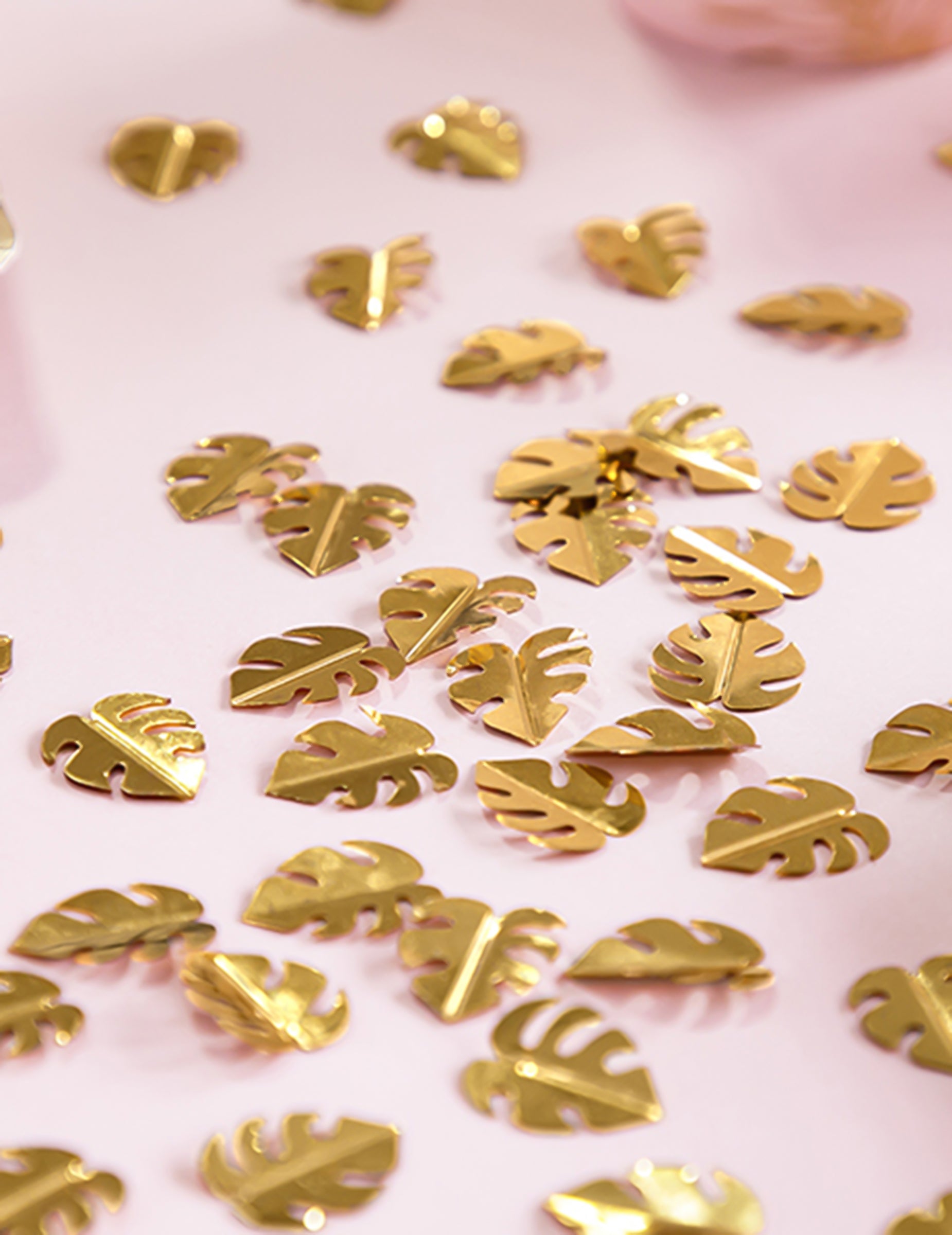Stolové konfety z tropických listov v metalickej zlatej farbe 15g na slávnostnú dekoráciu