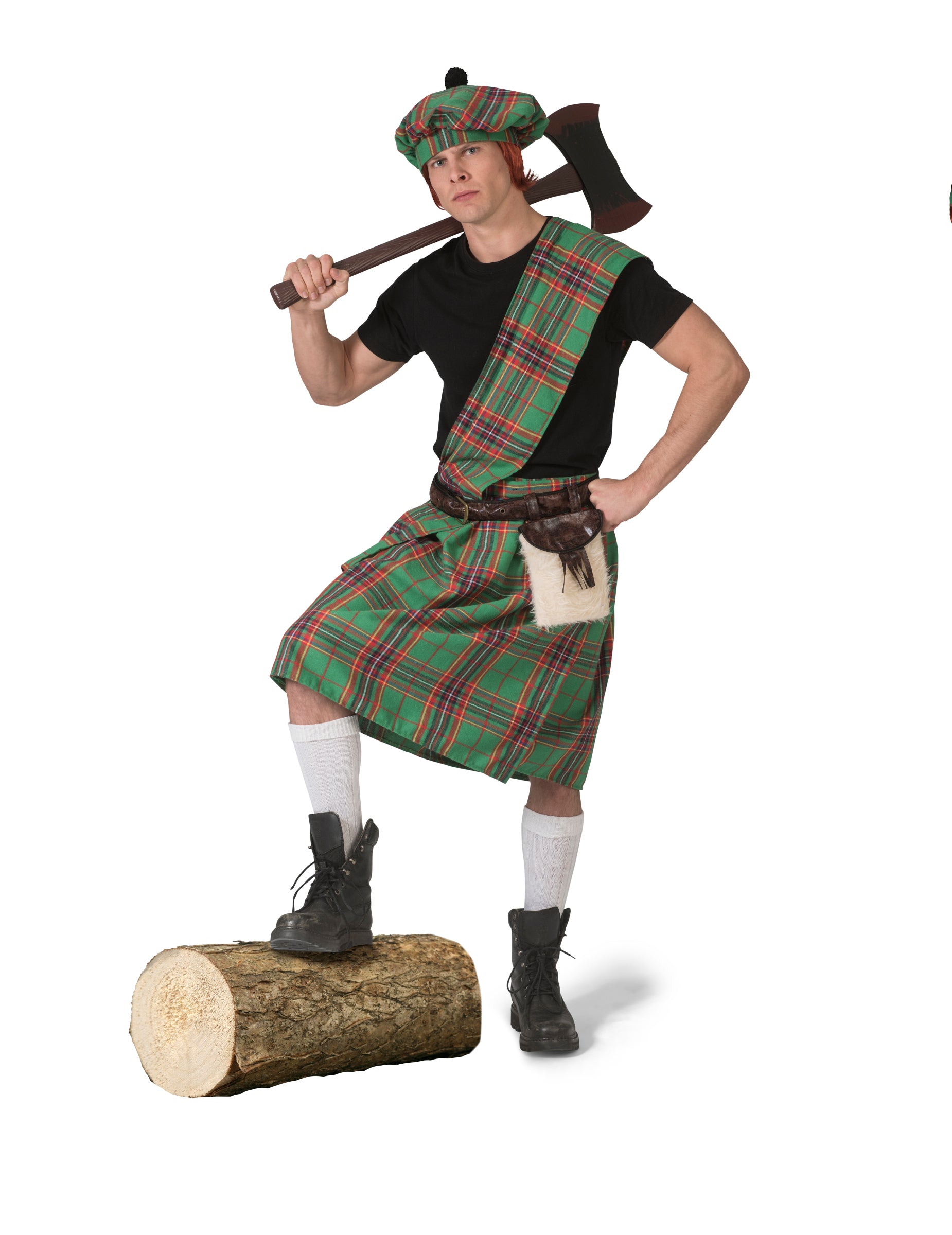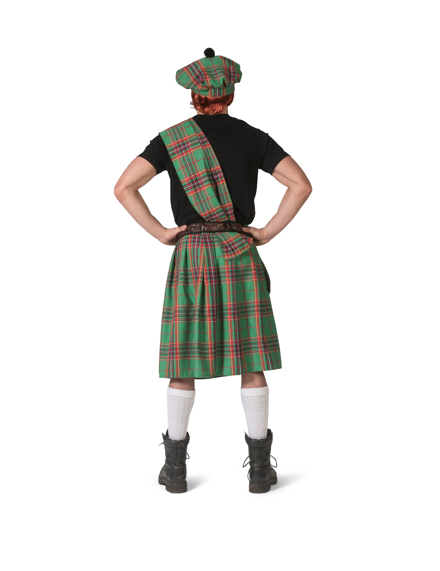 Škótsky kilt je v zelenom tartanovom vzore. Súčasťou je aj šál, ktorý sa prehodí cez jedno rameno.