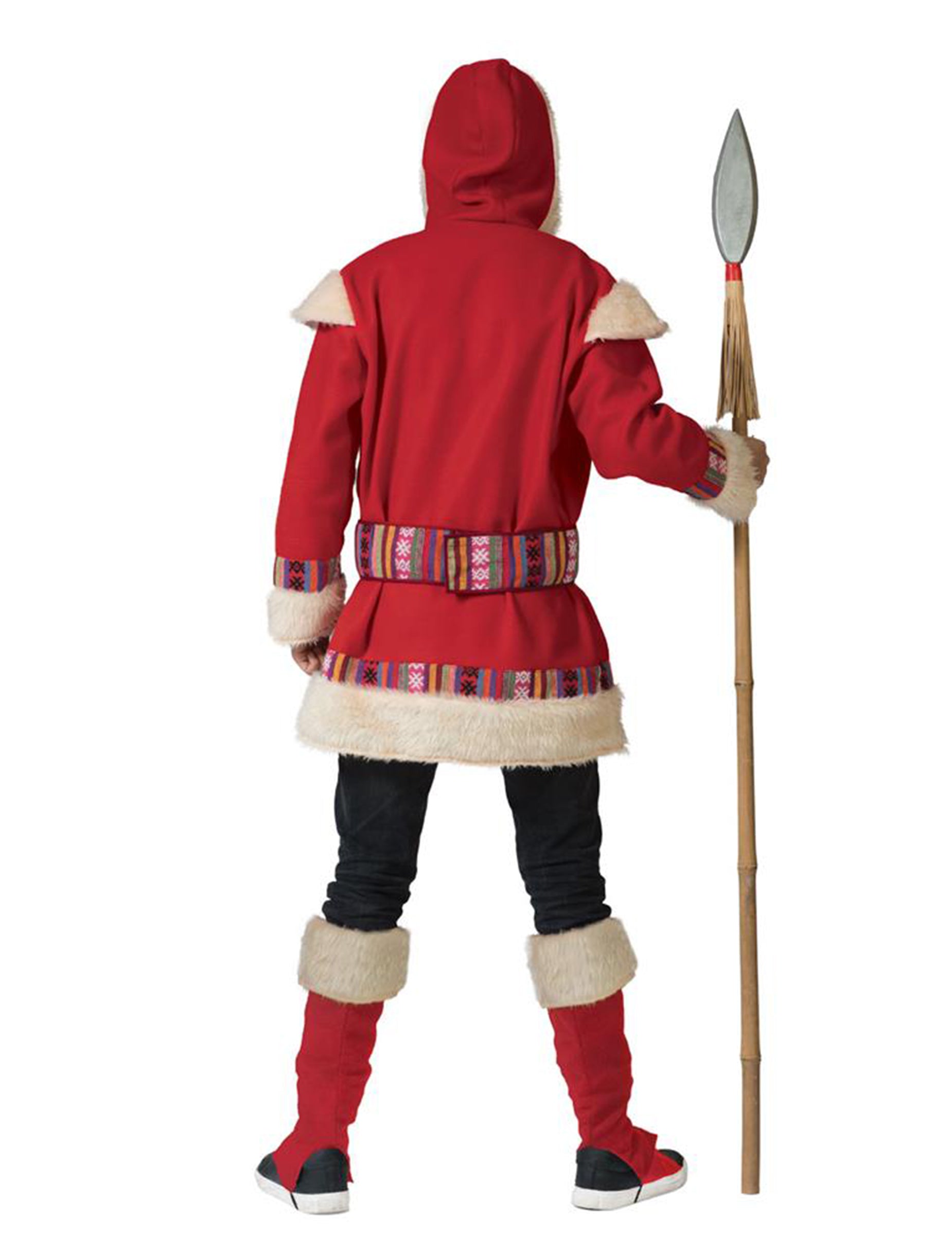 Toto maskovanie mužov Inuitov má tuniku s kapucňou s pásom a topánkami. Tunika je vyrobená z červenej látky. Kapucňa je šitá tunikom. Biela faux kožušina je prítomná na okrajoch tuniky, na pleciach a na kapote. Na tunike je prítomný farebný etnický vzor. Rovnaké dôvody sa prijímajú na úrovni goliera a okrajov tuniky. Prítomný je aj pár topánok. Je tiež červená s bielym faux srsti. Tento kostým Inuit Nanook bude ideálny na zostať v teple počas večera maskovaného s národmi sveta.